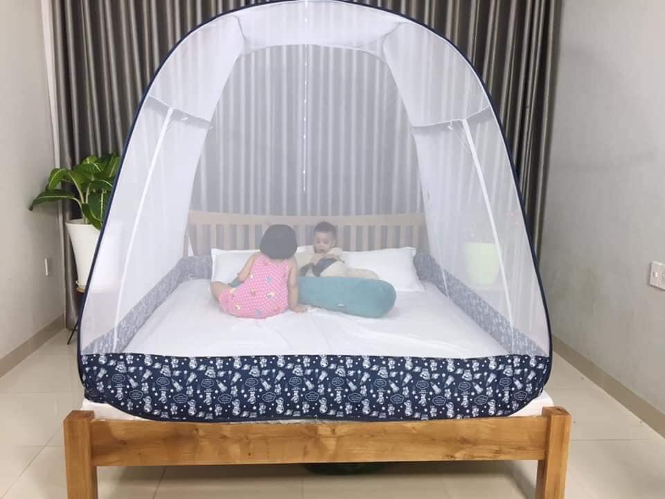 Kiểu dáng: Đỉnh rộng, có 2 cửa ra vào, có viền chân là từ vải nylon thay vì lưới mùng ( giúp bảo vệ 100% khi để tay chân chạm sát mùng)
