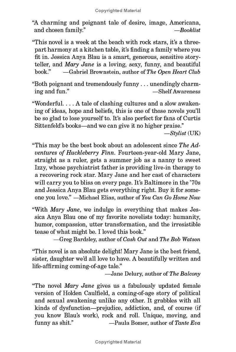 Over the course of the summer, Mary Jane introduces her new household to crisply ironed clothes and a family dinner schedule, and has a front-row seat to a liberal world of sex, drugs, and rock and roll (not to mention group therapy). Caught between the lifestyle she’s always known and the future she’s only just realized is possible, Mary Jane will arrive at September with a new idea about what she wants out of life, and what kind of person she’s going to be.