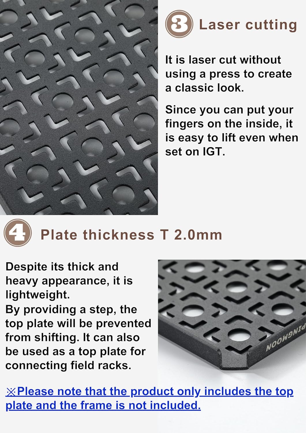 Mặt bàn nhôm một phần hai có họa tiết Campingmoon IGT CK-12F-2P được khắc bằng laser với họa tiết hiện đại có thể sử dụng trên bàn nướng, kệ CK-2, khung bàn IGT Campingmoon CK-3650-T38. Hai tấm nhôm này tương đương với một đơn vị tiêu chuẩn IGT nên cũng có thể được sử dụng để lấp đầy khoảng trống của các sản phẩm kệ sắt (IGT) khác.