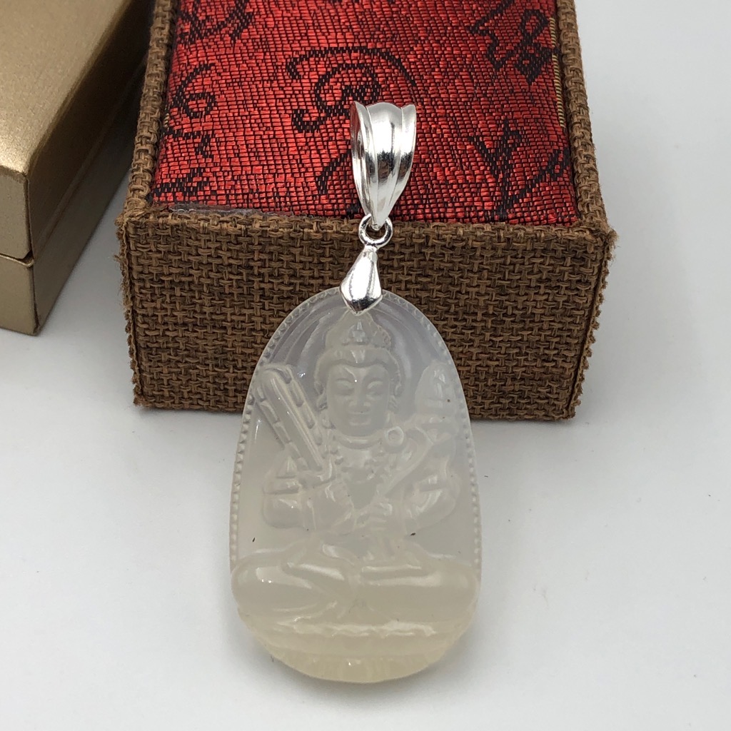 Mặt Phật Bà đứng Cẩm Thạch xanh trắng lí - Chất liệu: Ngọc Cẩm Thạch tự nhiên. - Màu sắc: Xanh lí phớt trắng - Kích thước: ngang 49mm, cao 23mm, dày 4mmx8mm - Mã kiểm định: 86691 - Tiêu chuẩn