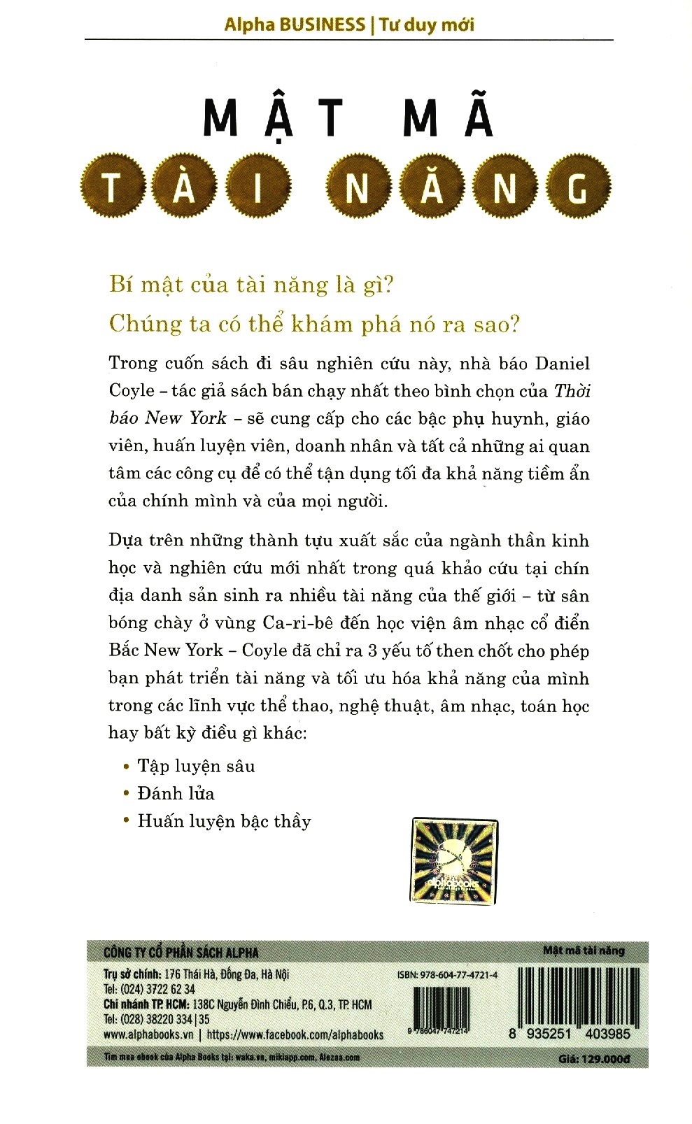 Dựa trên những thành tựu xuất sắc của ngành thần kinh học và nghiên cứu mới nhất trong quá trình đi tới 9 địa chỉ sản sinh ra rất nhiều tài năng của thế giới – từ sân bóng chày ở vùng Ca-ri-bê đến học viện âm nhạc cổ điển phía bắc New York – Coyle đã chỉ ra 3 yếu tố then chốt cho phép bạn phát triển tài năng và tối ưu hóa khả năng của mình trong các lĩnh vực thể thao, nghệ thuật, âm nhạc, toán học hay bất kỳ điều gì khác .