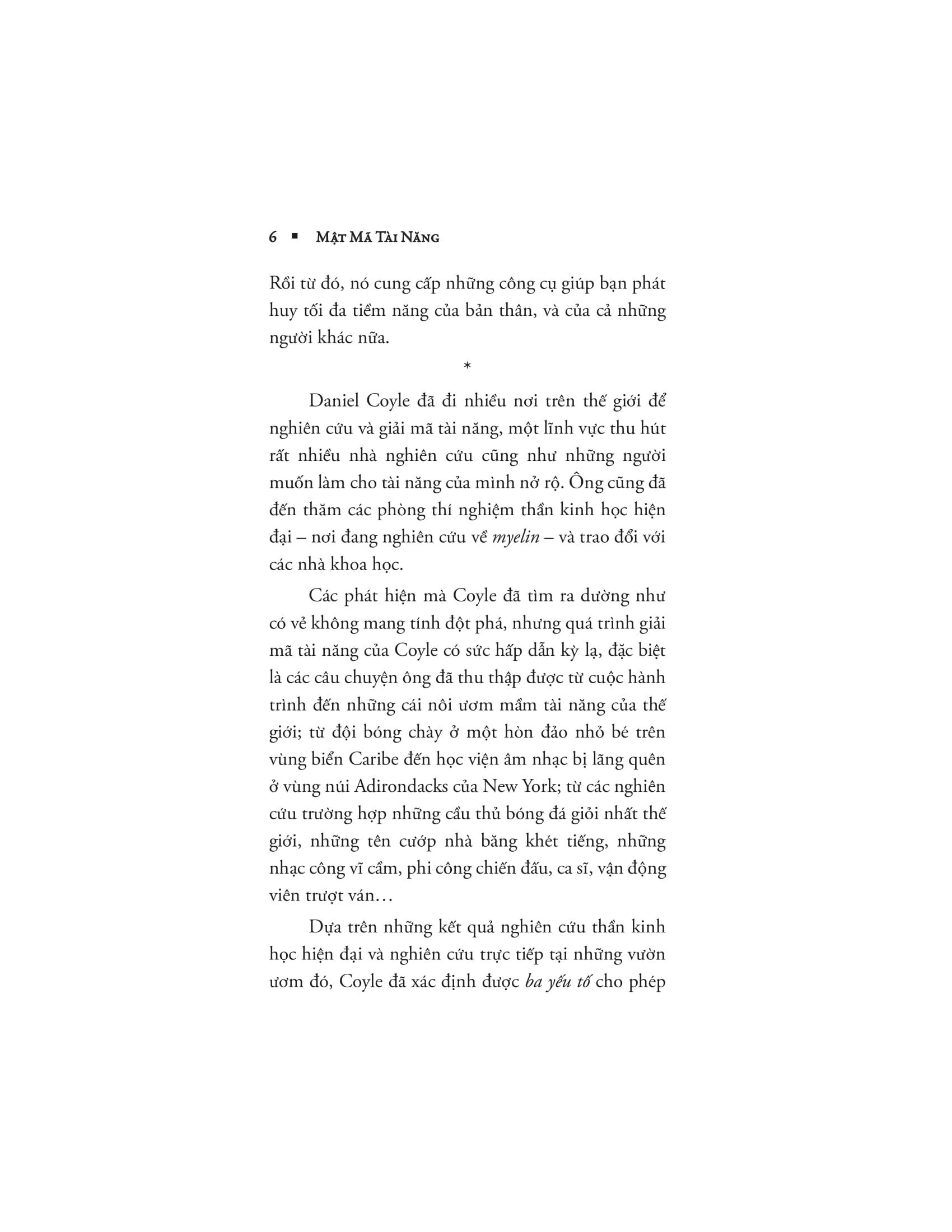 Mật Mã Tài Năng Bí mật của tài năng là gì? Chúng ta có thể khám phá nó ra sao? Trong cuốn sách đi sâu nghiên cứu này, nhà báo – tác giả có sách bán chạy nhất theo bình chọn của Thời báo New York – Daniel Coyle sẽ cung cấp cho các bậc phụ huynh, giáo viên, huấn luyện viên, doanh nhân – và mọi người khác nữa – các công cụ để có thể tận dụng tối đa các tiềm năng của chính bản thân và mọi người. Dù bạn đang huấn luyện cho một đội bòng bầu dục hay dạy một đứa trẻ chơi đàn piano, viết tiểu thuyết hay cố gắng cải thiện cú vung gậy trong môn bóng chày thì cuốn sách mang tính cách mạng này sẽ chỉ cho bạn biết cách nuôi dưỡng và phát triển tài năng thông qua việc khai thác và sử dụng một cơ chế mới được khám phá của não bộ. Dựa trên những thành tựu xuất sắc của ngành thần kinh học và nghiên cứu mới nhất trong quá trình đi tới 9 địa chỉ sản sinh ra rất nhiều tài năng của thế giới – từ sân bóng chày ở vùng Ca-ri-bê đến học viện âm nhạc cổ điển phía bắc New York – Coyle đã chỉ ra 3 yếu tố then chốt cho phép bạn phát triển tài năng và tối ưu hóa khả năng của m.ình trong các lĩnh vực thể thao, nghệ thuật, âm nhạc, toán học hay bất kỳ điều gì khác. +Tác giả: Daniel Coyle là tác giả của hai cuốn sách bán chạy nhất do Thời báo New York bình chọn, Cuộc chiến của Lance Armstrong và Bóng chày: Một mùa nằm trong dự án. Ông còn là biên tập viên góp ý cho Tạp chí Outside. Ông sống cùng vợ và 4 con tại Homer, bang Alaska. Đây cũng là nơi ông huấn luyện cho một đội bóng đang tiến bộ rất nhanh, Little League.