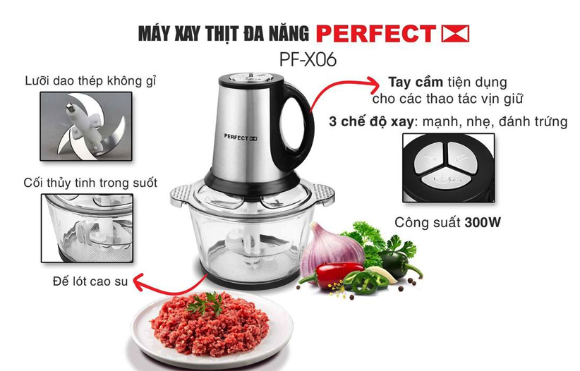 Thông số kỹ thuật: -Tên sản phẩm: Máy xay thịt đa năng Perfect PF-X06 xay thịt, cá,rau củ,quả,các loại thực phẩm,hành tỏi, ớt, gia vị - Thương hiệu: Perfect - Model: PF-X06 - Công suất: