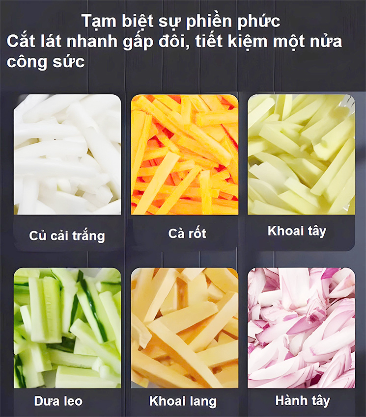 - Máy cắt rau củ Septree T1000 có chức năng cắt vuông nhiều loại củ quả như khoai lang, khoai tây, củ cải, cà rốt, su hào, dưa chuột… một cách nhanh chóng và đồng đều. Máy cắt khoai lang chiên thích hợp sử dụng trong các quầy đồ ăn nhanh, quán ăn vặt, KFC, quán cafe, nhà hàng, khách sạn hay các hộ kinh doanh nhỏ lẻ - Các món ăn từ khoai tây, khoai lang chiên, lắc đang là món ăn vặt hấp dẫn, và không thể thiếu trong thực đơn của các quán ăn nhanh, nhà hàng, hay cả trong các bếp ăn công nghiệp, bếp ăn trường học, các quán ăn vỉa hè,…