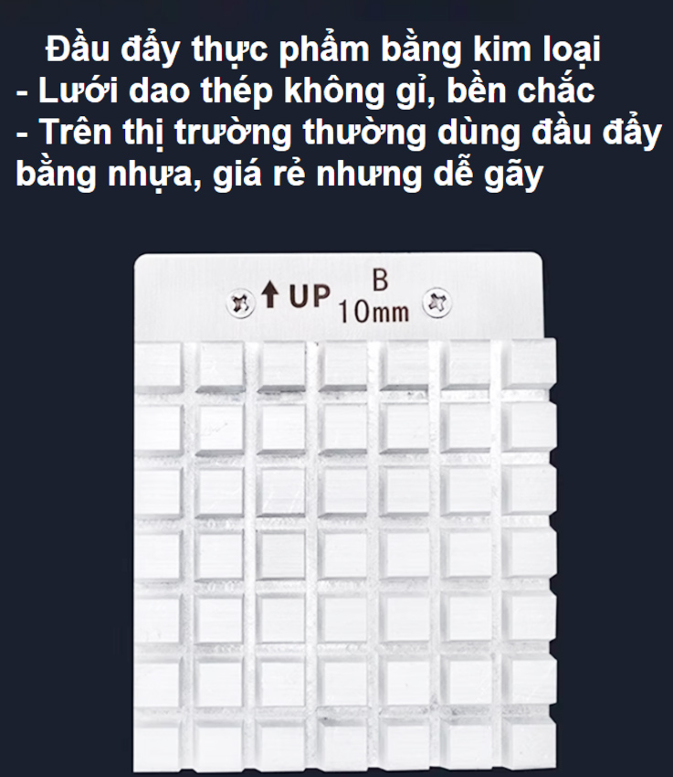 - Phía bên hông máy máy cắt khoai tây chiên có một nút điều khiển, nút này điều khiển lưỡi dao tiến và lùi. Với cơ chế điều khiển bằng nút, bạn không cần lo lắng về sự an toàn của đôi tay – không cần đưa tay vào trong máy – thao tác đơn giản và an toàn.