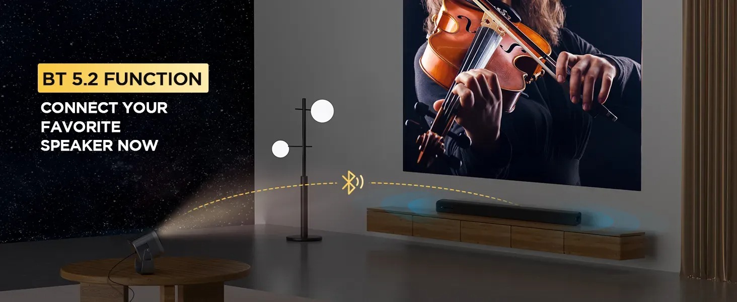 Ngoài ra, Máy chiếu hỗ trợ màn hình không dây, Hiệu ứng ánh sáng thời trang, Âm thanh kỹ thuật số Dolby, Cải thiện hình ảnh, WIFI băng tần kép, Bluetooth