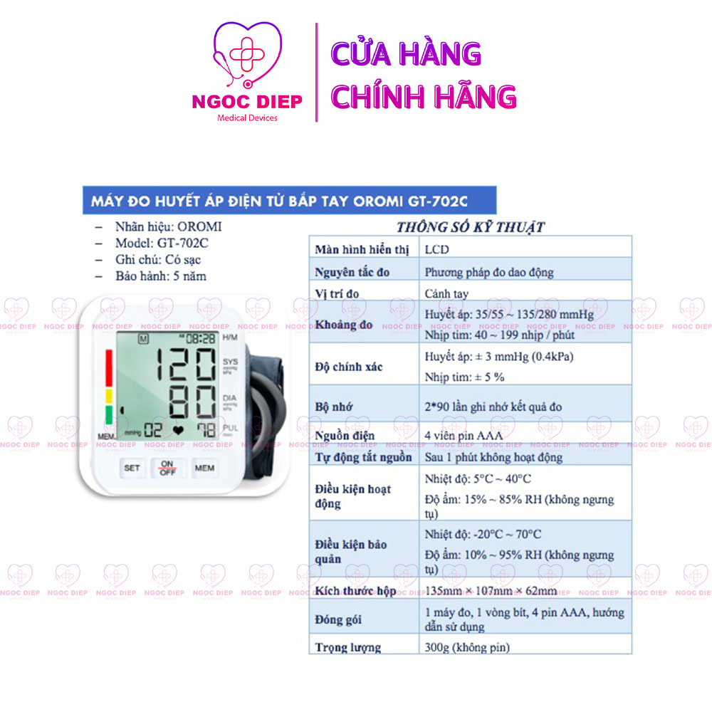 MÁY ĐO HUYẾT ÁP ĐIỆN TỬ BẮP TAY OROMI GT-702C TÍNH NĂNG NỔI BẬT - Vị trí đo huyết áp cố định: Bắp tay - Đo huyết áp tối đa (tâm thu), đo huyết áp