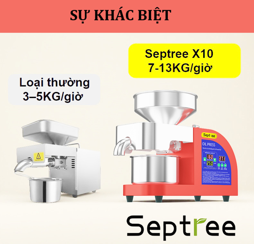 - Vấn đề sức khỏe hiện nay đang rơi vào tình trạng đáng báo động khi, các chủ cơ sở sản xuất, hộ kinh doanh dầu ăn chỉ chạy theo lợi nhuận mà bất chấp cung cấp ra thị trường các loại dầu ăn giả, kém chất lượng, gây tổn hại đến sức khỏe và tính mạng người tiêu dùng. Máy ép dầu thực vật công nghiệp Septree X10 là thiết bị giúp các đầu bếp có thể tự chế biến dầu ăn sạch ngay tại nhà hàng, khách sạn hay trường học nhanh chóng, chẳng còn lo dầu bẩn, dầu giả.
