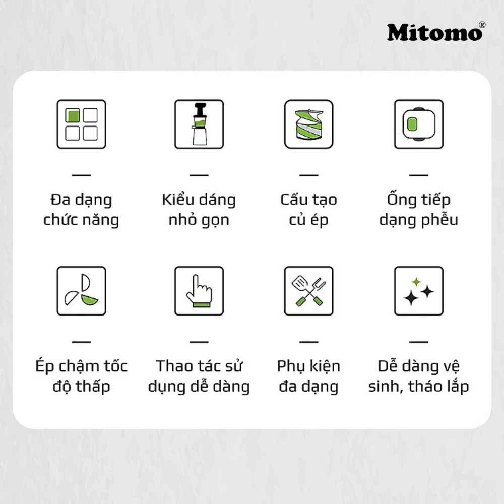 CÔNG DỤNG CHÍNH - Ép trái cây, rau, củ. TÍNH NĂNG VÀ VẬN HÀNH - Máy ép chậm Mutosi MJ-86 sử dụng phương pháp ép nén lạnh ở tốc độ chậm, khác với phương pháp