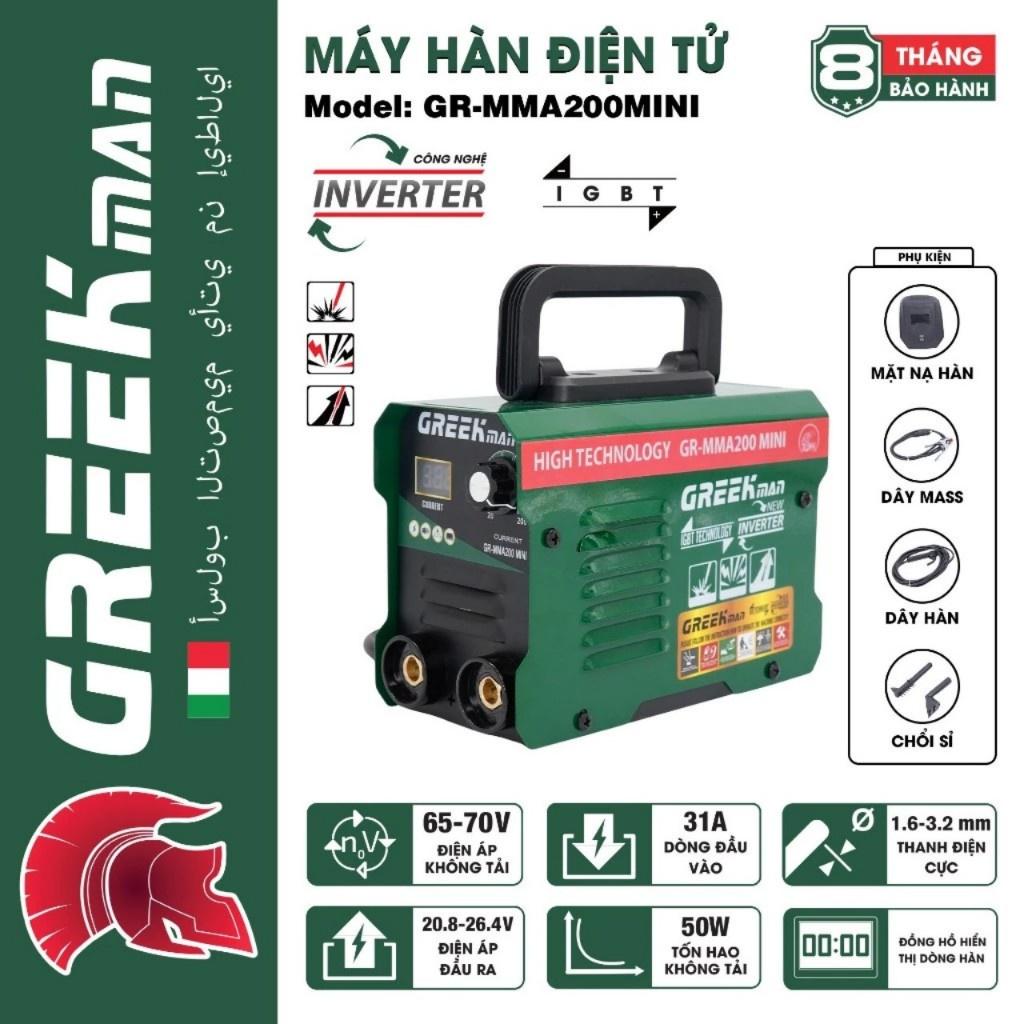 Máy hàn điện tử mini GREEK MAN MMA200,có khả năng hàn que 1.6-3.2 ly,hàn liên tục với que 2.5ly,hàn chấm điểm với que 3.2ly.Vỏ máy có kết cấu chắc chắn,có dây đeo thuận tiện di chuyển,logo dập nổi chống hàng giả.