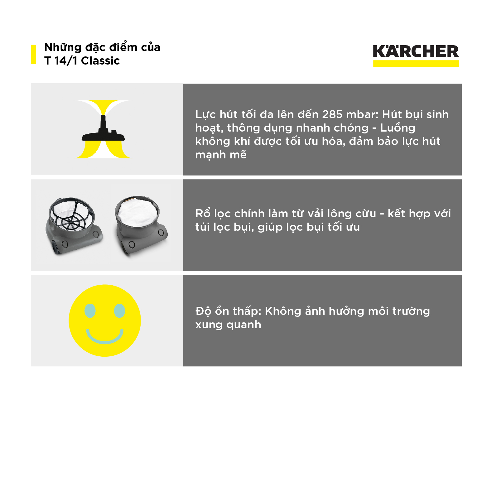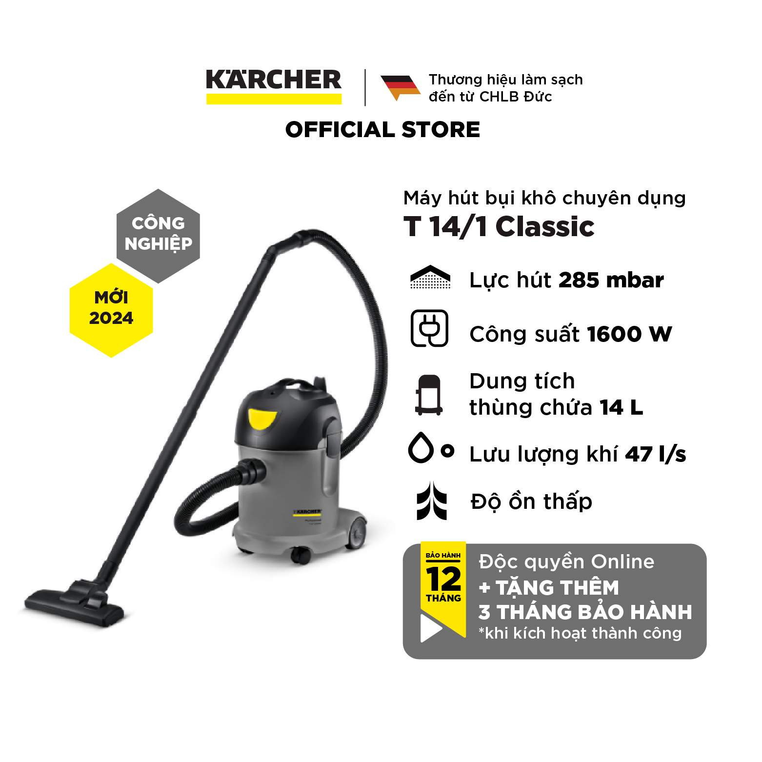 - Máy hút bụi khô công nghiệp Karcher T 14/1 Classic là một thiết bị nhẹ, bền bỉ và có hiệu suất hút mạnh mẽ.