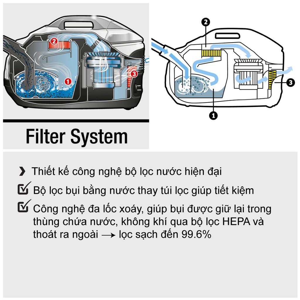 - Với cơ chế hoạt động bụi được hút vào bên trong máy hút bụi, không khí cuộn xoáy tròn trong thùng chứa nước, lúc này bụi sẽ được giữ lại ở đây, khí sạch sẽ được thoát ra đi lên bộ lọc gấp li ở bên trên của máy, tiếp sau đó qua bộ lọc HEPA (bộ lọc cao cấp và được rất nhiều nhà sản xuất hút bụi tin dùng) và thoát ra ngoài môi trường. Theo cơ chế này, chúng ta có thể thấy, máy hút bụi gia đình DS 6 sử dụng đa bộ lọc ( lọc nước, lọc gấp li và lọc HEPA), vì vậy những bụi bẩn, kể cả vi khuẩn siêu vi vẫn được giữ lại bên trong máy, và đây cũng là lí do máy DS 6 là một dòng máy hút bụi bán chạy tại Châu Âu