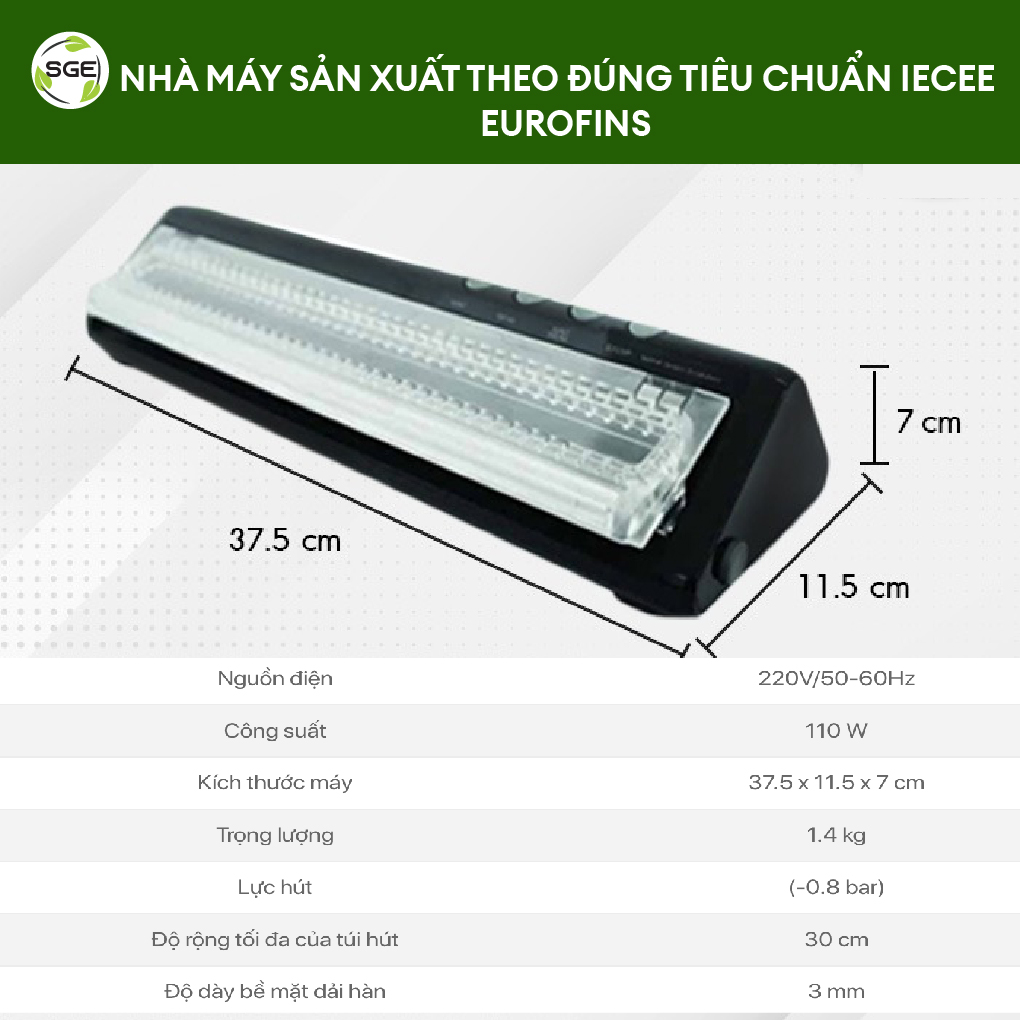 - Được làm bằng vật liệu EVA chất lượng tốt, chắc chắn. MÁY HÚT CHÂN KHÔNG CẦM TAY GIA ĐÌNH VCX Máy hút chân không gia đình VCX – đỉnh cao công nghệ bảo quản thực phẩm. Máy có chức năng loại bỏ không khí khỏi bao bì thực phẩm, làm cho một số vi sinh vật trong thực phẩm ngừng phát triển (thực phẩm sẽ bị hư hỏng chậm hơn) và giảm không gian lưu trữ cũng như kiểm soát mùi hôi. Có thể kéo dài tuổi thọ sản phẩm lâu hơn. Ngoài việc được sử dụng rộng rãi trong ngành công nghiệp thực phẩm, máy hút chân không cfon được sử dụng trong ngành công nghiệp phụ tùng, thiết bị điện tử (để chống gỉ hoặc mòn do tiếp xúc với không khí) VIDEO GIỚI THIỆU SẢN PHẨM MÁY HÚT CHÂN KHÔNG MINI VCX VIDEO GIỚI THIỆU SẢN PHẨM MÁY HÚT CHÂN KHÔNG MINI VCX Máy hàn hút chân không VCX được thiết kế mạnh mẽ hơn nhưng vẫn giữ được sự đơn giản để có thể di chuyển dễ dàng. Máy có thể hoạt động liên tục nhiều giờ hơn so với dòng máy nhỏ. Thiết kế dễ sử dụng, mặt trước trong suốt để người dùng có thể sắp xếp miệng túi cho đẹp và dễ làm việc hơn. Đặc biệt máy được trang bị nút dừng khẩn cấp khi đang sử dụng. Các tính năng bổ sung của máy hút chân không VCX Máy không có hệ thống lưỡi hút nên chỉ sử dụng được với túi mặt nhám. Tuy nhiên dòng máy này có thể đóng gói cả đồ khô và đồ ướt cũng như có thể hàn miệng túi mà không cần hút chân không. Máy còn có thể được dùng để đóng gói túi gạo acrylic chắc chắn và đẹp mắt. KÍCH THƯỚC THỰC TẾ THÔNG SỐ KỸ THUẬT MÁY HÚT CHÂN KHÔNG MINI VCX Máy hút chân không mini VCX được thiết kế mạnh mẽ hơn nhưng vẫn giữ được sự đơn giản và tiện dụng. Ngoài ra, nắp máy ở mặt trước trong suốt cho phép người dùng có thể quan sát khi xếp miệng túi, giúp đóng gói bao bì đẹp mắt hơn. Do máy hút chân không mini không dùng hệ thống lưỡi hút nên chỉ có thể được sử dụng được với túi hút chân không một mặt nhám. Tuy nhiên, máy lại có thể hút chân không đối với cả sản phẩm khô và ướt. Hơn nữa, máy còn có thể hàn miệng túi riêng biệt mà không cần phải hút chân không. Đặc biệt, máy sử dụng được với cả hộp Acrylic đóng gói gạo để tạo ra các bao bì rất thẩm mỹ. Xem thêm về bao bì . Ngoài ra, nếu nhu cầu bảo quản thực phẩm lớn hơn và thường xuyên hơn, xin giới thiệu sản phẩm . THÔNG SỐ KỸ THUẬT MÁY HÚT CHÂN KHÔNG MINI VCX ĐẶC ĐIỂM NỔI BẬT MÁY HÚT CHÂN KHÔNG VCX Máy hút chân không có thể đóng gói tất cả các loại thực phẩm, kéo dài tuổi thọ gấp 10 lần Máy đóng gói hút chân không chất lượng cao, giá cả phải chăng, có thể đóng gói túi gạo một cách hoàn hảo. Nắp acrylic dày trong suốt, dễ dàng sắp xếp túi. Có thể được sử dụng cùng với nút chân không để bảo quản rượu chất lượng tốt Dùng với bình hút chân không để tiết kiệm và có thể tái sử dụng. Các nút chức năng có thể điều chỉnh cho phù hợp theo nhu cầu. Khóa nắp chắc chắn để quá trình hàn tốt và nhanh hơn Khe hút chân không có kích thước phù hợp cho mọi loại túi MÁY HÚT CHÂN KHÔNG SGE TỐT NHƯ NÀO?