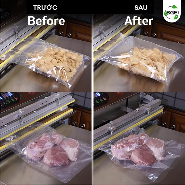 - Sử dụng được với hầu hết mọi loại túi, giảm đến hơn 50% chi phí đầu tư (Có thể sử dụng được cho cả túi nóng/lạnh/giấy bạc/nhôm/kraft ..) THÔNG SỐ KỸ THUẬT MÁY Máy hút chân không công nghiệpVC99-G2-50VC99-G2-60VC99-G2-80SCông suất1000W1000W1000WNguồn điện220V220V220VChất liệu thân máyInox201Inox201Inox201Lực hút -0.85 Bar-0.85 Bar-0.85 BarNăng lực sản xuất/giờ300 túi/giờ300 túi/giờ300 túi/giờKích thước máy (WxLxH)600340450MM700340450MM9004201030MMChiều rộng tối đa của túi hút50 cm60 cm80 cmĐộ dày dải hàn8 mm8 mm8 mmĐế của máyĐặt bànĐặt bànĐặt sàn có bánh xeTrọng lượng máy33 kg35 kg70 kgLưỡi hút1 Lưỡi hút1 Lưỡi hút2 Lưỡi hútBảo hành1 năm1 năm1 năm TÍNH NĂNG MÁY HÚT CHÂN KHÔNG CHẾ ĐỘ HÚT NITƠ Máy hút chân không VC99-G2 có hệ thống thổi khí nitơ vào bao bì sản phẩm sau khi hút chân không. Rất dễ sử dụng và hỗ trợ sử dụng bằng bàn đạp chân. Lý do là đối với một số sản phẩm như snack giòn hoặc chuối tẩm gia vị chiên, bắt buộc phải có cách đóng gói đăc biệt, vì nếu chúng ta hút toàn bộ chân không thì sẽ khiến cho sản phẩm nhanh chóng bị hỏng hoặc dập nát. Sản phẩm có thể bị hỏng nên ưu tiên sử dụng phương pháp nén khí nitơ để thay thế. Thực tế thú vị: Khí nitơ là loại khí ít phản ứng nhất với thực phẩm. Vì vậy, loại gas này thường được sử dụng để duy trì độ giòn và giúp sản phẩm không bị ôi do dầu dùng để chiên. CHỨC NĂNG HÀN LIÊN TỤC Máy hút chân không cỡ lớn, hoạt động nhanh chóng, hoạt động liên tục nhất trên thị trường, tốc độ lên tới 4-5 túi/phút. TẶNG KÈM 2 LƯỠI HÚT SGE đã lắp đặt một máy bơm chân không cỡ lớn có thể hút chân không mạnh và triệt để hơn. Tự tin với lực hút mạnh lên tới -0,85 bar, lực hút nhanh, mạnh, tiết kiệm thời gian khi niêm phong, đóng gói các loại nguyên liệu thô khác nhau. VC99-G2-50 và VC99-G2-60 trang bị 1 lưỡi hút. VC99-G2-80S được trang bị 2 lưỡi hút TOÀN BỘ THÂN MÁY ĐƯỢC LÀM BẰNG THÉP KHÔNG GỈ Được làm bằng thép không gỉ 201 toàn thân máy. Là vật liệu dễ dàng để làm sạch bền và chống ăn mòn và làm mát tốt. Bền bỉ và chắc chắn hơn TẢN NHIỆT TỐT HƠN TRƯỚC Máy hút chân không VC99-G2 mới có khả năng tản nhiệt tốt hơn trước. Có thể sử dụng liên tục tối đa 6 tiếng, nhưng nên nghỉ 30 phút để hạ nhiệt lượng nhiệt tích tụ từ dải seal và bảo quản máy lâu dài ĐỘ DÀY DẢI HÀN Đảm bảo an toàn hơn trước. Đi kèm với nút dừng khẩn cấp. Ngay khi chúng ta nhấn nút công tắc khẩn cấp, nó sẽ ngừng hoạt động ngay lập tức. Để ngăn ngừa các tai nạn khác nhau có thể nguy hiểm. HỖ TRỢ CHIỀU RỘNG LÊN TỚI 80 CM Hỗ trợ công việc tốt hơn tăng diện tích hàn hơn trước. Chiều rộng dải hàn tối đa là 80cm. Thích hợp cho các doanh nghiệp SME để hỗ trợ đóng gói rộng hơn. ĐI KÈM VỚI BỘ LỌC CHO NƯỚC DƯ THỪA Đi kèm với một bể chứa để chứa nước dư thừa. Được lắp ở cạnh máy có thể hút chân không cả nguyên liệu khô và ướt, nhưng không thích hợp lắm cho việc hàn ướt. Đáp ứng nhu cầu đa dạng của doanh nghiệp. Tăng tiềm năng cho các loại “hút chân không” và “nitơ” chỉ có thể được sử dụng với nguyên liệu thô ẩm ướt. ĐỘNG CƠ BẰNG ĐỒNG NGUYÊN CHẤT 100% Trái tim của máy hút chân không là động cơ bằng đồng. Chịu nhiệt tốtkhông bị tan chảy ngay cả khi sử dụng trong thời gian dài công suất tối đa 980W, có khả năng hút chân không nhanh chóng, tiết kiệm công sức và thời gian làm việc. TRANG BỊ THÊM BÁNH XE VÀO BÊN TRONG Đi kèm với bánh xe ở cả 4 góc, có thể di chuyển máy hàn kín một cách thoải mái theo mẫu VC99-G2-80. LƯU Ý KHI SỬ DỤNG VC99 CÁC LOẠI TÚI SỬ DỤNG ĐƯỢC VỚI MÁY HÚT CHÂN KHÔNG VC-99 Giảm chi phí túi tới 50%, tiết kiệm chi phí và dễ dàng để sản xuất Tăng thêm giá trị cho sản phẩm nhiều lần. Bởi vì nó có thể được niêm phong với tất cả các loại túi!! Làm cho giá thành sản phẩm rẻ hơn 2 lần để có nhiều lợi nhuận hơn. Đáng giá về lâu dài Không cần phải sử dụng nhiều máy. Để niêm phong nhiều loại túi, chỉ cần sử dụng máy này cho tất cà MẸO BẢO QUẢN THỰC PHẨM Nếu nguyên liệu của bạn vẫn tươi và có thể bảo quản được lâu hơn. Nguyên liệu được đóng gói trong túi hút chân không. Giúp ngăn chặn sự phát triển của vi khuẩn kéo dài thời gian bảo quản 3 – 5 lần, tùy thuộc vào loại thực phẩm được đông lạnh* HÌNH ẢNH THỰC TẾ