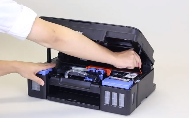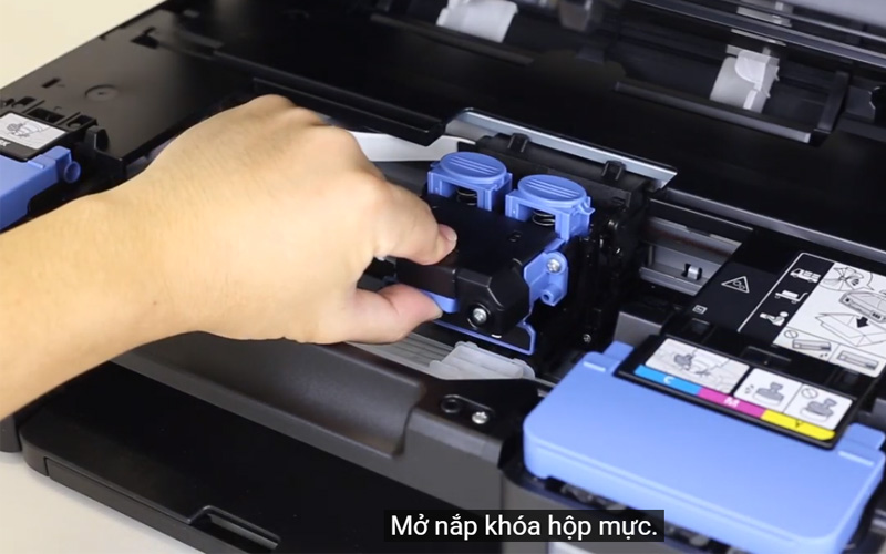 Mở bộ quét/nắp, mở nắp khay bình mực và bơm mực tương thích.