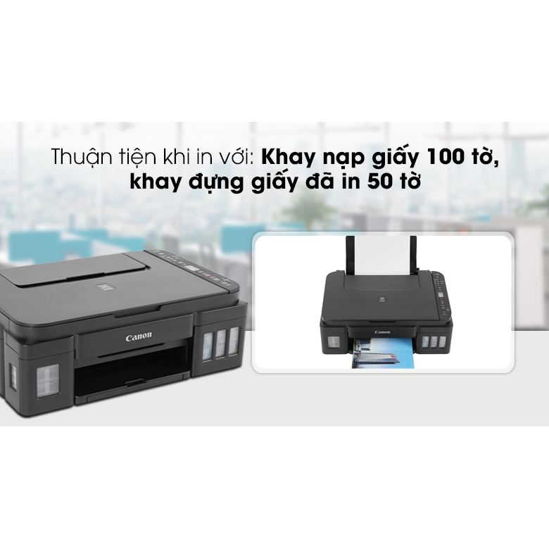 In liên tục, không cần nạp thêm giấy in với khay nạp giấy 100 tờ, khay chứa giấy in 50 tờ