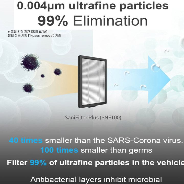 - Tẩm lọc SaniFiler Plus lọc 3 giai đoạn mạnh mẽ độc đáo loại bỏ tới 125 chất gây ô nhiễm có hại và khí thải và các loại virut, thông qua các lớp HEPA và HESA. Được chứng nhận độc lập bởi Airmid Healthgroup, công nghệ SaniFilter Plus cũng loại bỏ tới 99% các hạt bụi siêu mịn và các chất gây dị ứng trong xe. Lọc hiệu quả các hạt nhỏ đến 0,004um, bao gồm các loại vi rút và vi khuẩn tức là nhỏ hơn 40 lần so với Virut SARS-Corona, nhỏ hơn 100 lần so với các loại virut thông thường . Công nghệ lá chắn UVC