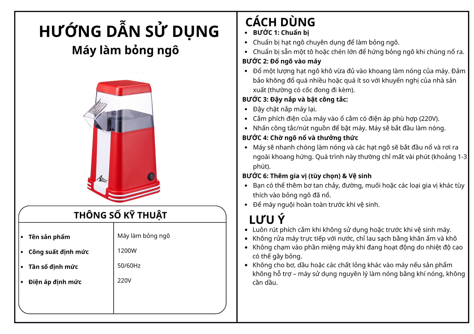Máy làm bỏng ngô AL-14228 là thiết bị gia dụng hiện đại giúp bạn dễ dàng chế biến những bắp ngô nổ thơm ngon, giòn rụm ngay tại nhà. Với công suất mạnh mẽ 1200W và tần số định mức 50/60Hz, máy hoạt động hiệu quả, nhanh chóng làm nóng và nổ bỏng ngô chỉ trong vài phút. Sản phẩm thích hợp sử dụng trong các buổi xem phim, tiệc tùng hay giải trí gia đình, mang đến trải nghiệm thưởng thức bỏng ngô tiện lợi và an toàn.