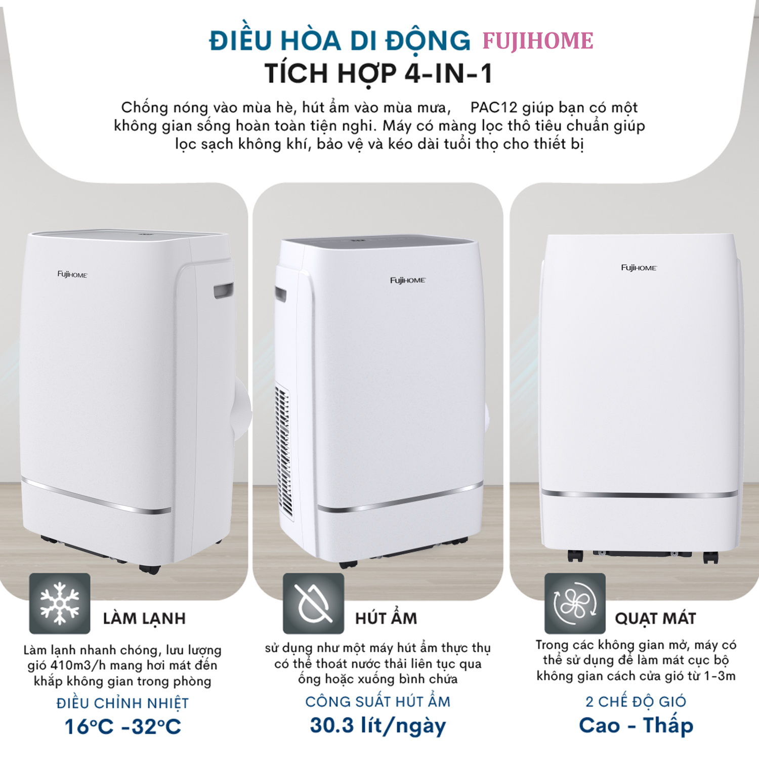✨Máy lạnh di động 12.000 BTU FUJIHOME PAC12, máy lạnh đứng di động mini kết nối Wifi điều khiển qua App, 4 chức năng, làm lanh, hút ẩm, lọc không khí, quạt - Hàng chính hãng