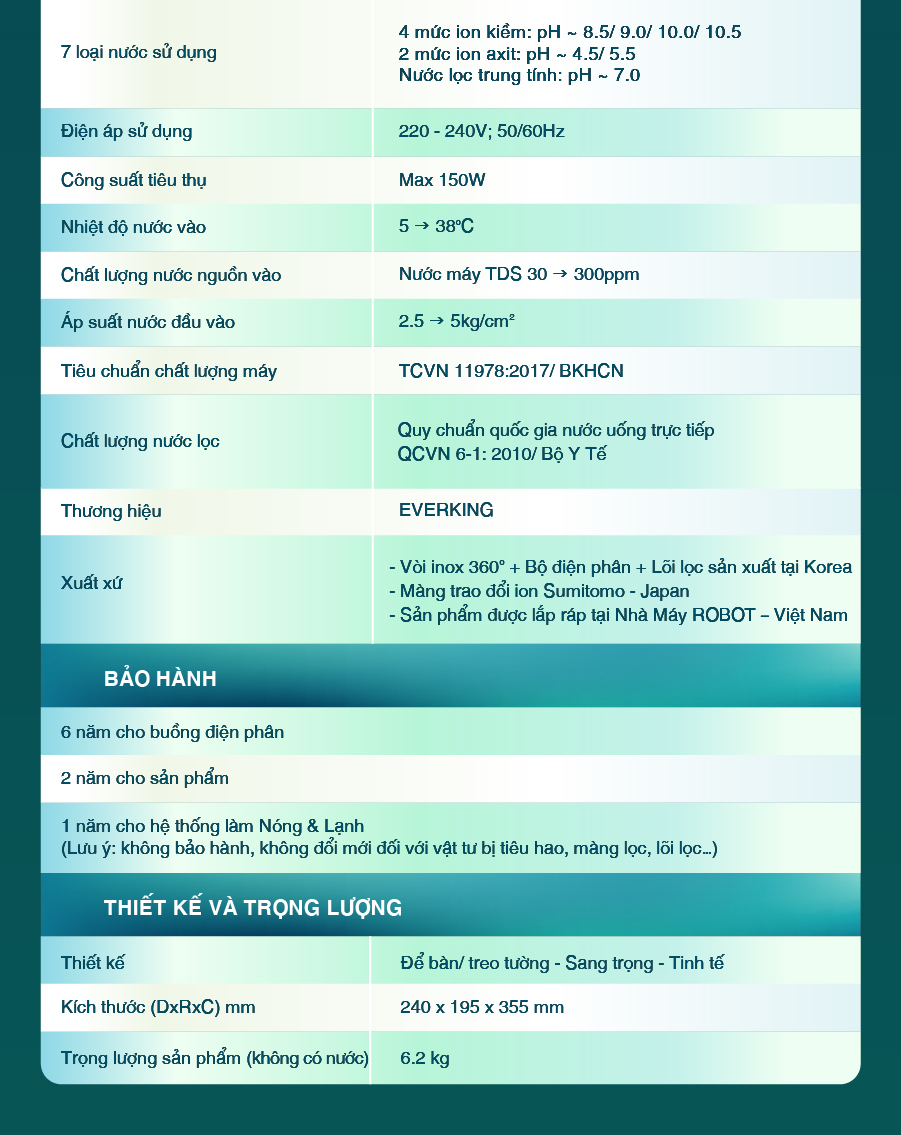 - Mặt trước dùng chất liệu nhựa ABS cao cấp, kết hợp tole sơn tĩnh điện bền bỉ. 2.3. Bảo hành chính hãng – tối ưu chi phí & dịch vụ 2.4. Chất lượng Quốc tế được chứng nhận bởi các Tổ chức uy tín Chất lượng của Máy lọc nước điện giải ion kiềm EVERKING được công nhận bởi các Tổ chức uy tín trong và ngoài nước. Sản phẩm đạt chứng nhận Thiết bị Y Tế & An toàn điện Châu Âu CE, TCVN/QCVN của Bộ Khoa học – Công nghệ, ISO, đăng ký FDA,… là lời cam kết thiết thực dành cho người dùng. THÔNG SỐ KỸ THUẬT