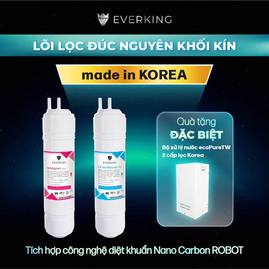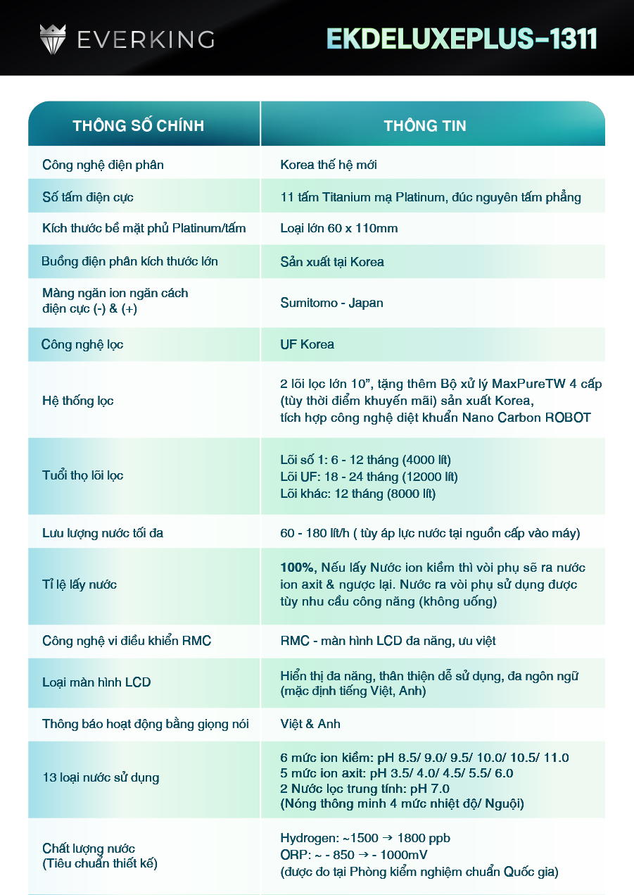 - 2 Nước lọc trung tính pH 7.0 (Nóng thông minh 4 mức nhiệt độ/Nguội) Chất lượng nước đạt chỉ số tối ưu, nồng độ Hydro hoạt tính lên đến ~ 1500 -> 1800 ppb, chống oxy hóa (ORP) lên đến ~ -850 -> -1000 mV, chỉ số lý tưởng của máy lọc nước điện giải ion kiềm, được kiểm nghiệm trực tiếp tại Phòng Thí Nghiệm chuyên nghiệp cấp quốc gia. Chỉ số Hydrogen, ORP của nước tùy thuộc số tấm điện cực, đặc tính nguồn nước & “điều kiện đo trong phòng thí nghiệm chuyên nghiệp, đạt chuẩn”. Tích hợp chức năng Nóng Thông Minh đầy tiện ích – Đạt Kỷ Lục Châu Á – Bản quyền phát minh sáng chế Công nghệ vi điều khiển RMC/LCD tiên tiến, khác biệt vượt trội: Đỉnh cao công nghệ điện phân Korea Hệ thống đa cấp lọc hoàn hảo EVERKING EKDeluxePlus-1311 được tích hợp công nghệ UF tiên tiến lọc nước trung tính, với hệ thống lọc đa cấp sản xuất Hàn Quốc vẫn “giữ được các khoáng chất tự nhiên của nước cho quá trình điện phân tạo nước điện giải bền vững 24/24 suốt vòng đời của máy”. Kiểu dáng hiện đại thiết kế thông minh Máy lọc nước điện giải EVERKING EKDeluxePlus-1311 có kiểu dáng mới nhất, chuyên để bàn hoặc treo tường, thêm chức năng Nóng Thông Minh vô cùng độc đáo, duy nhất thị trường - phù hợp mọi không gian như nhà bếp, phòng ăn, phòng khách, văn phòng, Với sắc màu xanh trắng cẩm thạch chủ đạo, sản phẩm tạo nên cảm giác sang trọng, thư thái và đẳng cấp cho người sử dụng. Giá thành phải chăng cho mọi nhà Nếu so sánh với các sản phẩm nhập khẩu EVERKING EKDeluxePlus-1311 có chất lượng vượt trội, đạt chuẩn quốc tế, nhưng giá thành siêu tiết kiệm. Đặc biệt, chi phí thay lõi lọc cũng luôn được nhà sản xuất đảm bảo trong mức dưới 2.000.000đ/năm. Kết hợp chế độ bảo hành chính hãng, luôn sẵn có vật tư linh kiện thay thế nhanh chóng với mức phí ưu đãi nhất. CHỨNG NHẬN CHẤT LƯỢNG EVERKING EKDeluxePlus-1311 đạt các chứng nhận cấp quốc tế, Thiết bị Y Tế & An Toàn Điện Châu Âu CE, đăng ký FDA, xác lập Kỷ Lục Việt Nam, Châu Á & Thế Giới, Đĩa Vàng Sáng Tạo Thế Giới, đăng ký bản quyền sáng chế tại Quốc Tế. TAB THỒNG SỐ KỸ THUẬT