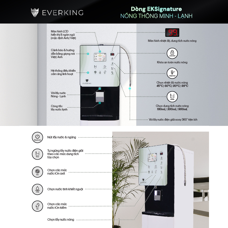 - Kiểu dáng Tủ Đứng mới nhất thị trường, phù hợp sử dụng tại nhà bếp, phòng ăn, đặc biệt đối với phòng khách, văn phòng,… sang trọng, tôn vinh đẳng cấp cho người sử dụng. Bản quyền sáng chế tại Việt Nam & Quốc Tế, nhiều tiện ích khác biệt vượt trội Công nghệ RMC-LCD mới nhất, hiển thị chi tiết, dễ dàng kiểm soát, sử dụng EVERKING là dòng máy duy nhất có khả năng cung cấp nhiều loại nước điện giải nhất thị trường hiện nay so với loại cùng tấm điện cực, EKSignature-125 tạo đến 12 loại nước chức năng, phục vụ mọi nhu cầu sinh hoạt, gồm: