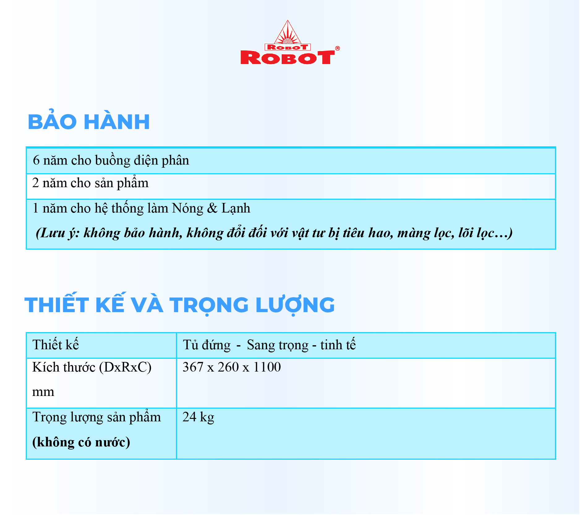 • Hệ thống điều khiển cảm ứng trên mặt phủ kính với màn hình LCD tinh tế     Với mong muốn nhiều gia đình Việt có thể sử dụng nước điện giải iON kiềm với chi phí hợp lý để bảo vệ sức khỏe, sắc đẹp & nâng cao chất lượng cuộc sống, ROBOT mang đến sản phẩm “Chất lượng Quốc tế - Giá thành Việt Nam”, phù hợp với mức sống của nhiều người. Tiết kiệm cho người tiêu dùng đến hơn một nửa chí phí so với máy nhập khẩu chỉ từ 30 – 50%, nhưng sở hữu nhiều ưu điểm, tính năng vượt trội, chất lượng cao.  Chế độ bảo hành chính hãng, tận nơi, vật tư và linh kiện, lõi lọc luôn có sẵn hạn chế tối đa chi phí sửa chữa, bảo trì.     VĐV Cầu Lông Nguyễn Tiến Minh – tay vợt từng đứng Top 5 Thế Giới chia sẻ: Sau một thời gian sử dụng Máy lọc nước điện giải iON kiềm Minh thấy cải thiện sức khỏe rất nhiều và tốc độ hồi phục sau tập luyện, thi đấu cũng nhanh hơn so với trước đây. Bây giờ mỗi khi đi tập, hay khi đi thi đấu, Minh đều mang theo nước iON kiềm để uống. ROBOT là một thương hiệu Việt Nam uy tín nên Minh hoàn toàn tin tưởng và lựa chọn Máy lọc nước điện giải iON kiềm ROBOT.     Ghi chú:  Chỉ số thiết kế Hydrogen, ORP tuỳ theo số tấm điện cực, điều kiện đo trong phòng thí nghiệm chuyên nghiệp, đạt chuẩn (tham khảo kết quả kiểm nghiệm).