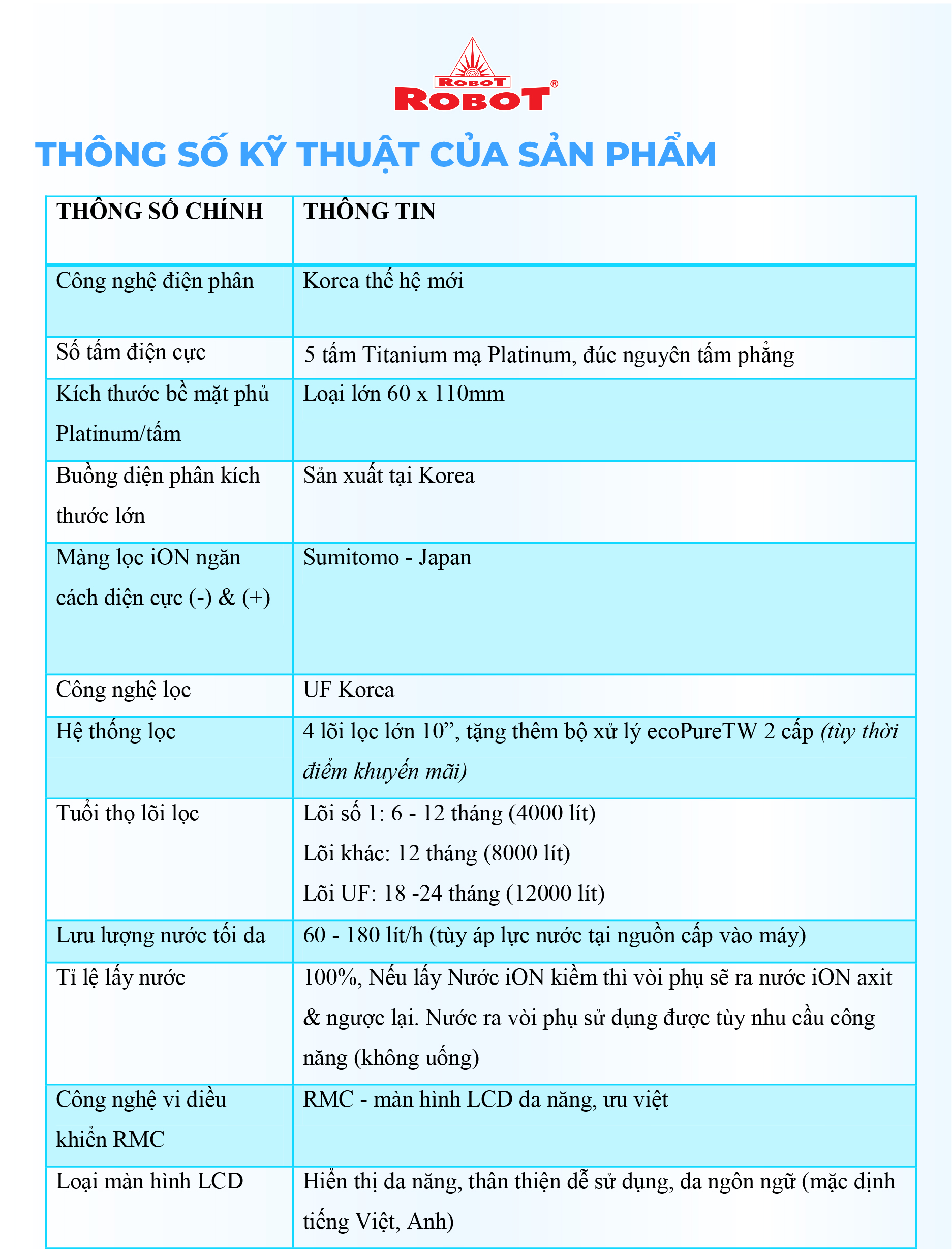 - Với mong muốn nhiều gia đình Việt có thể sử dụng nước điện giải iON kiềm với chi phí hợp lý để bảo vệ sức khỏe, sắc đẹp & nâng cao chất lượng cuộc sống, ROBOT mang đến sản phẩm “Chất lượng Quốc tế - Giá thành Việt Nam”, phù hợp với mức sống của nhiều người. Tiết kiệm cho người tiêu dùng đến hơn một nửa chí phí so với máy nhập khẩu chỉ từ 30 – 50%, nhưng sở hữu nhiều ưu điểm, tính năng vượt trội, chất lượng cao.