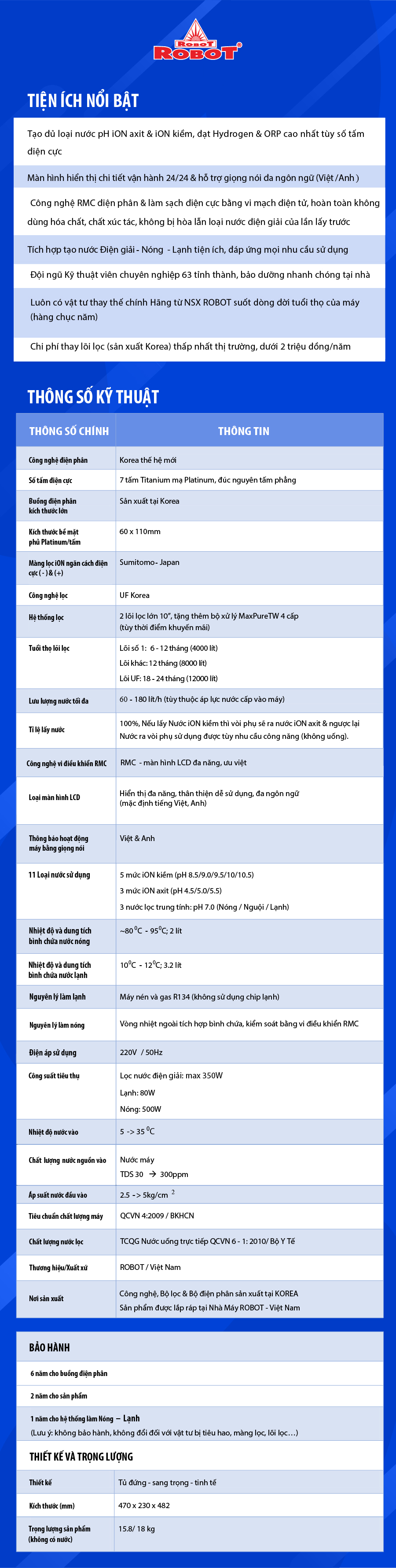 Máy lọc nước điện giải iON kiềm ROBOT UHC 4711 là model đặc biệt sản xuất với công nghệ tiên tiến hàng đầu thế giới, trang bị đến 7 tấm điện cực lớn nhất, có khả năng tạo ra đến 11 loại nước đa chức năng, với 5 mức nước iON kiềm (pH 8.5 - 10.5), nước lọc trung tính - Nóng - Lạnh (pH 7.0) & 3 mức nước iON axit (pH 4.5 - 5.5), có thể điều chỉnh, thay đổi tùy theo đặc tính nguồn nước tại nơi lắp đặt. Với nồng độ Hydro hoạt tính lên đến ~800 -> 950 ppb, chống oxy hóa (ORP) lên đến ~-400 -> -600 mV, đáp ứng mọi nhu cầu sử dụng trong cuộc sống.