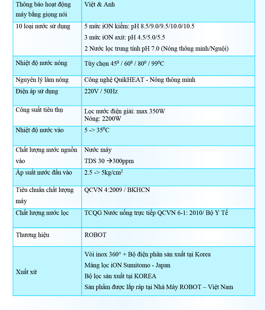 - Kiểu lắp đặt: Tủ đứng - Loại máy: Máy lọc nước RO hydrogen ion kiềm - Công nghệ lọc: RO kết hợp điện phân tạo nước ion kiềm - Số lõi lọc: 7 lõi - Lõi lọc thô: - Lõi 1: PP 5 micron (Sx Việt Nam) - Lõi 2: Than hoạt tính (Sx Việt Nam) - Lõi 3: Lõi Cation (Sx Việt Nam) - Lõi 4: PP 1 micron (Sx Việt Nam) - Lõi RO/Nano/UF: - RO 100 GPD sản xuất Hàn Quốc - Lõi chức năng: - Lõi 6: OrpH Hydrogen (Sx Việt Nam)Lõi 7: Nano Carbon (Sx Việt Nam) - Bảng điều khiển: Không có - Chỉ số nước: pH Không - Dung tích bình chứa: 6 lít - Tỉ lệ lọc - thải: Lọc 4.8 - Thải 5.2