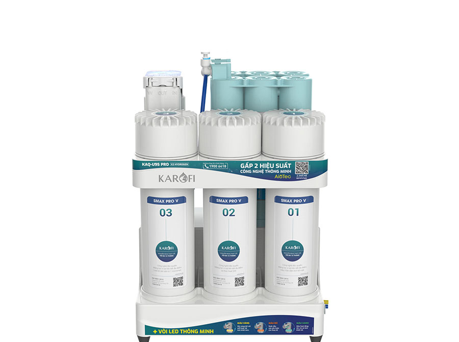 - – Màu vàng: Sẵn sàng kết nối wifi hoặc độ tinh khiết kém Máy Lọc Nước Ro Karofi Kaq U95 Pro HỆ THỐNG 10 LÕI LỌC SMAX 10 lõi lọc thế hệ mới công nghệ Smax giúp gấp 2 công suất, gấp 2 tuổi thọ, đồng thời tăng cường hydrogen chống lại quá trình oxy hóa, tăng cường sống khỏe mỗi ngày. Máy Lọc Nước Ro Karofi Kaq U95 Pro LÕI LỌC THÔ CÔNG NGHỆ SMAX PRO V HOÀN TOÀN MỚI 3 lõi lọc thô Smax Pro V công nghệ Smart Connect chống hàng giả, hàng nhái, gấp 3 diện tích tiếp xúc, gấp 2 hiệu quả lọc, gấp 2 tuổi thọ và bảo vệ hiệu quả hệ thống lọc. Thời gian thay lõi tối đa lên tới 12 tháng. Máy Lọc Nước Ro Karofi Kaq U95 Pro MÀNG LỌC RO PURIFIM 100 GPD THAY NHANH SẢN XUẤT TẠI MỸ Màng RO 100 GPD sản xuất tại Mỹ có khả năng loại bỏ đến 99,99% chất độc hại trong nước, bao gồm virus, vi khuẩn, ion kim loại nặng, asen, chất hữu cơ… tạo nguồn nước tinh khiết chuẩn an tâm. Máy Lọc Nước Ro Karofi Kaq U95 Pro HỆ LÕI CHỨC NĂNG SMAX HP 6.2 NGUYÊN KHỐI VÔ TRÙNG VỚI CÔNG NGHỆ TÍCH HỢP 3 CHỨC NĂNG HYDROGEN – ION KIỀM VÀ KHOÁNG CHẤT (3 TRONG 1) Bổ sung gấp 2 hàm lượng Hydrogen và ORP; hỗ trợ loại bỏ các tác nhân oxi hóa, trung hòa acid thừa tốt cho hệ tiêu hóa đồng thời bổ sung nhiều khoáng chất tốt cho cơ thể. Thiết kế đúc nguyên khối, giúp tiết kiệm không gian tới 44%, giảm thiểu rò rỉ và tái nhiễm khuẩn, tiết kiệm thời gian và công sức trong việc thay thế, lắp đặt. Máy Lọc Nước Ro Karofi Kaq U95 Pro NƯỚC SAU LỌC ĐẠT CHUẨN NƯỚC UỐNG TINH KHIẾT ĐÓNG CHAI QCVN 6-1:2010/BYT Nguồn nước sau lọc từ máy lọc nước nóng lạnh Karofi KAQ-U95 Pro đạt chuẩn nước uống tinh khiết đóng chai QCVN 6-1:2010 BYT do Viện Sức khỏe nghề nghiệp & Môi trường – Bộ Y Tế công nhận. Link công bố Máy Lọc Nước Ro Karofi Kaq U95 Pro
