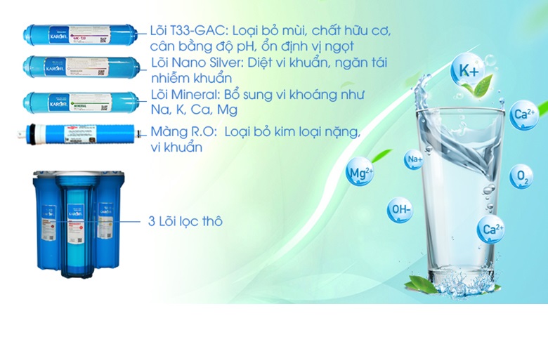 Tác dụng của các lõi lọc trong Máy lọc nước nóng lạnh Karofi HCV208RO 1.1 Hệ thống lọc RO - Nhóm lọc thô: Công nghệ Smax Pro V - Màng RO: Công nghệ Smax RO - Nhóm lọc