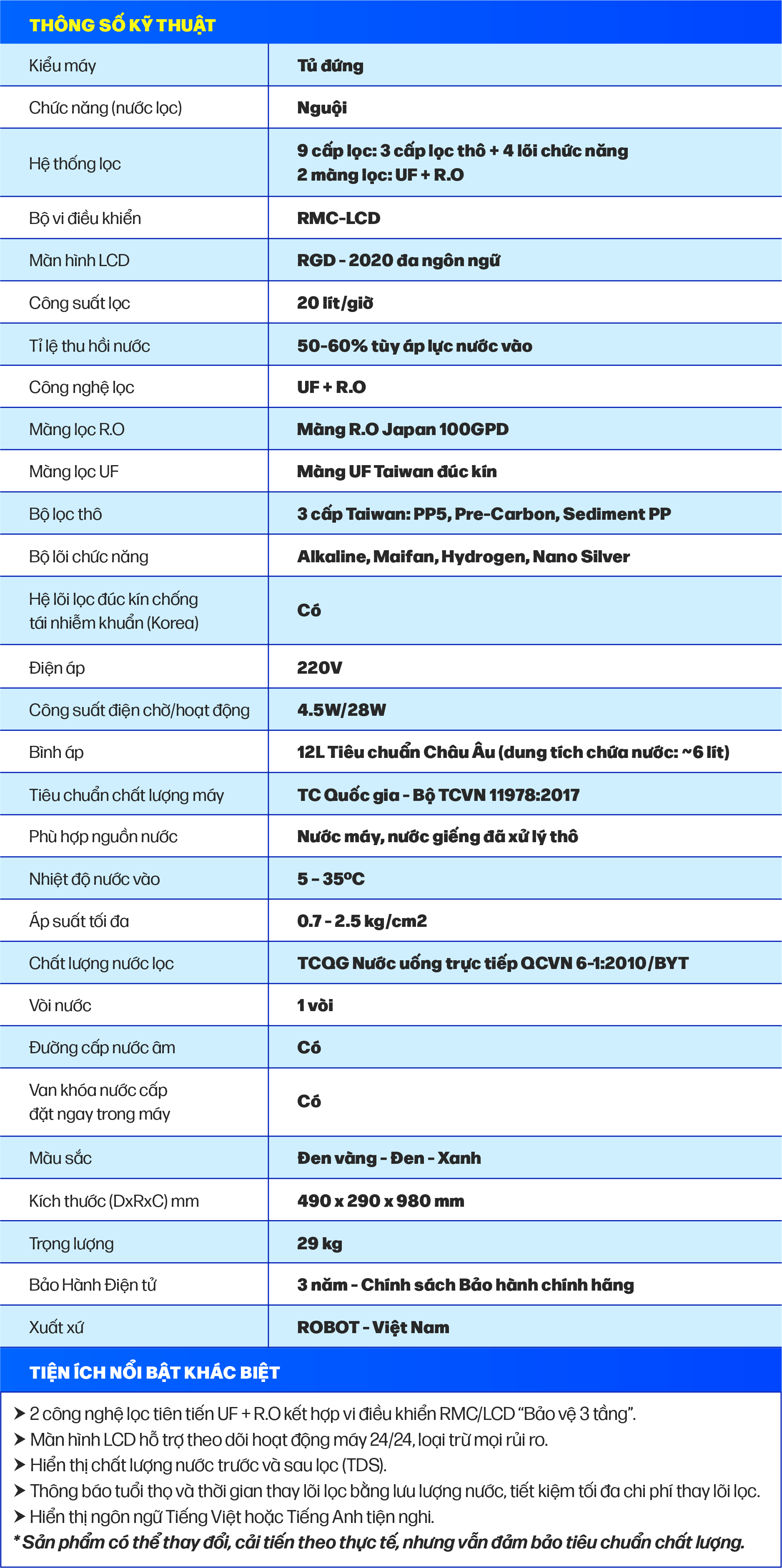 • Công nghệ RMC – LCD độc quyền, biết được chất lượng nước trước & sau lọc     Bộ vi mạch RMC-LCD thông minh thiết kế phát minh của ROBOT, mọi chi tiết vận hành máy được hiển thị trên màn hình LCD, cảnh báo mọi rủi ro cho người sử dụng   Tuổi thọ lõi lọc được tính theo lưu lượng nước sử dụng, không tính theo thời gian ghim điện như các máy thông thường