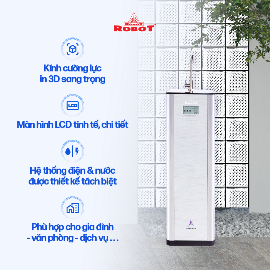 • Kích thước máy nhỏ gọn tối ưu, không chiếm diện tích, phù hợp mọi không gian lắp đặt.   Máy lọc nước ROBOT Thế hệ mới có kiểu dáng hiện đại, tinh tế, phù hợp với nhiều không gian và phong cách nội thất khác nhau