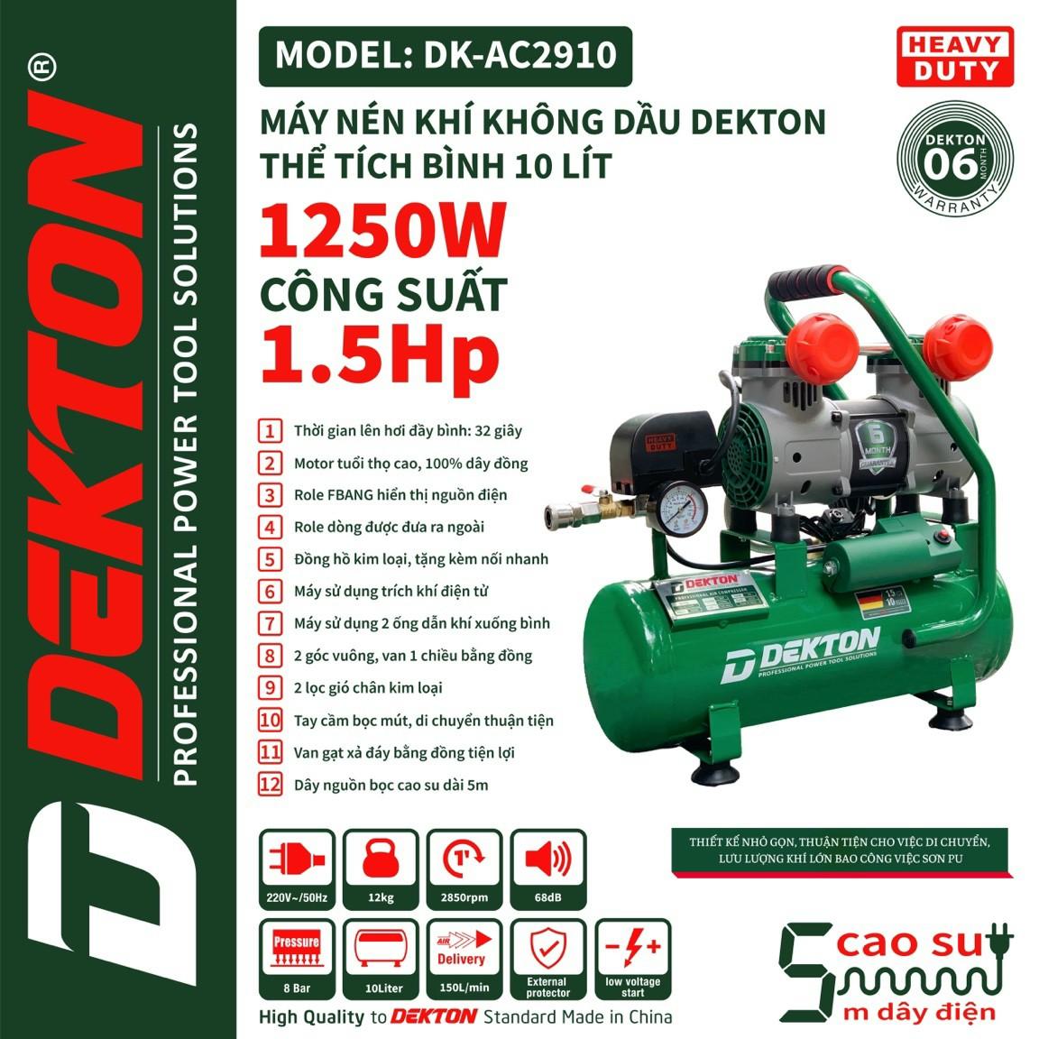 Thông số kỹ thuật -Model: DK-AC2910 -Thương hiệu: Dekton -Sản xuất: Trung Quốc -Công suất: 1.5HP – 1250W -Điện áp: 220v-240v/50hz -Áp lực: 8Kg/cm2- 115 PSI -Tốc độ lên hơi: 150 L/Phút -Bình chứa: 10L -Trọng lượng : 12kg -Bảo hành: 6 tháng