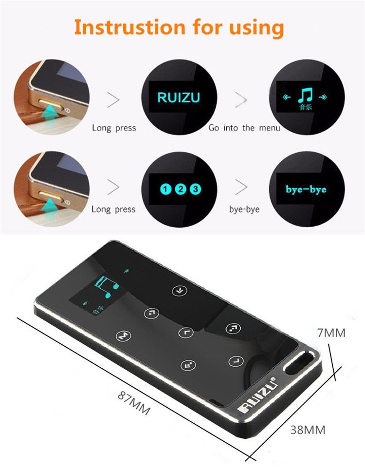 Thông số sản phẩm: Thương hiệu: Ruizu Độ phân giải: 240*320 Màn hình TFT Thời gian sạc: khoảng 2 giờ Phát lại điểm dừng: Hỗ trợ phát lại điểm dừng Chip giải mã DAC: Giải