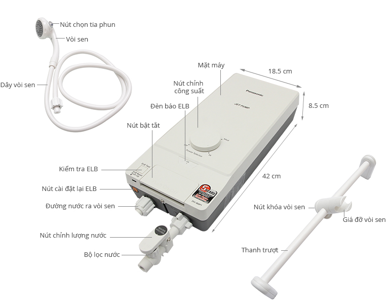 - ĐƯỢC KHUI THÙNG KIỂM TRA sản phẩm trước khi thanh toán/ký nhận Thông tin sản phẩm Loại máy: Làm nóng trực tiếp (phù hợp miền Nam hoặc khu vực trên 20°C) Công suất làm nóng: 4500W Dung tích bình chứa: Không có bình chứa Nhiệt độ làm nóng tối đa tham khảo: Khoảng 51°C Bơm trợ lực: Có Vòi sen: Có kèm theo vòi sen 3 chế độ phun Chế độ an toàn: 9 tính năng an toàn điện: Cầu dao ELCB, Cảm biến lưu lượng nước, Vỏ máy chống nước IP25, Kiểm soát nhiệt độ,... Tiện ích: Bơm trợ lực vận hành siêu êm Tùy chỉnh nhiệt độ nước: 3 mức Thấp - Trung bình - Cao Áp lực nước hoạt động: Hãng không công bố Thời gian đun nóng có thể sử dụng được: Nóng liền Lớp cách nhiệt: Foam cách nhiệt chất lượng cao Dòng sản phẩm: 2017 Thương hiệu của: Nhật bản Sản xuất tại: Malaysia Chất liệu - Kích thước Chất liệu lòng bình: Không có bình chứa Chất liệu vỏ máy: Nhựa Polyamid siêu mềm Chất liệu vòi sen: Nhựa cao cấp Chất liệu giá đỡ vòi sen: Nhựa cao cấp Kích thước - Khối lượng: Cao 42 cm - Rộng 18.5 cm - Dày 8.5 cm - Nặng 4.2 kg Hãng: Panasonic.