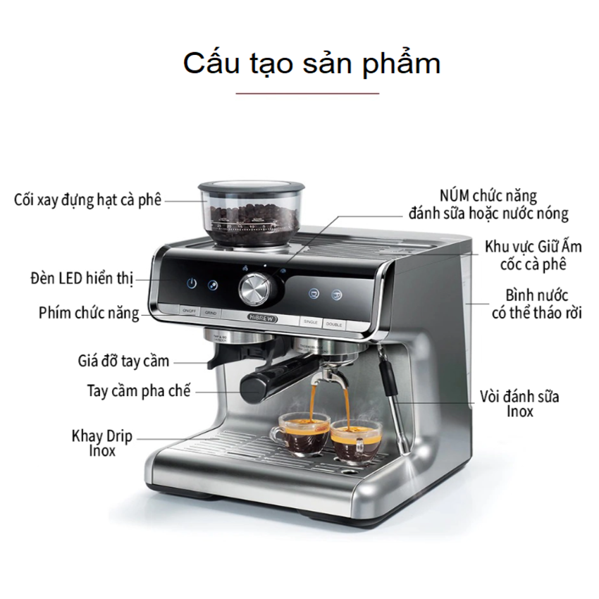 - Pha cà phê espresso, xay hạt, tạo bọt sữa và đồng hồ do áp suất 3 trong 1