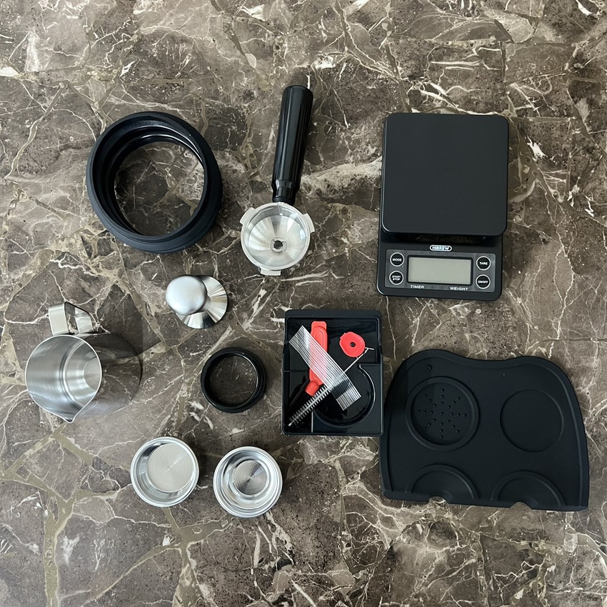 - Bộ sản phẩm bao gồm: 1 thân máy, 1 bình xay bột; 2 phin lọc inox, 1 tay cầm tiêu chuẩn 58mm, 1 tay nén, 1 ca đánh sữa, 1 tấm đệm nén, 1 cân điện tử, 1 sách HDSD