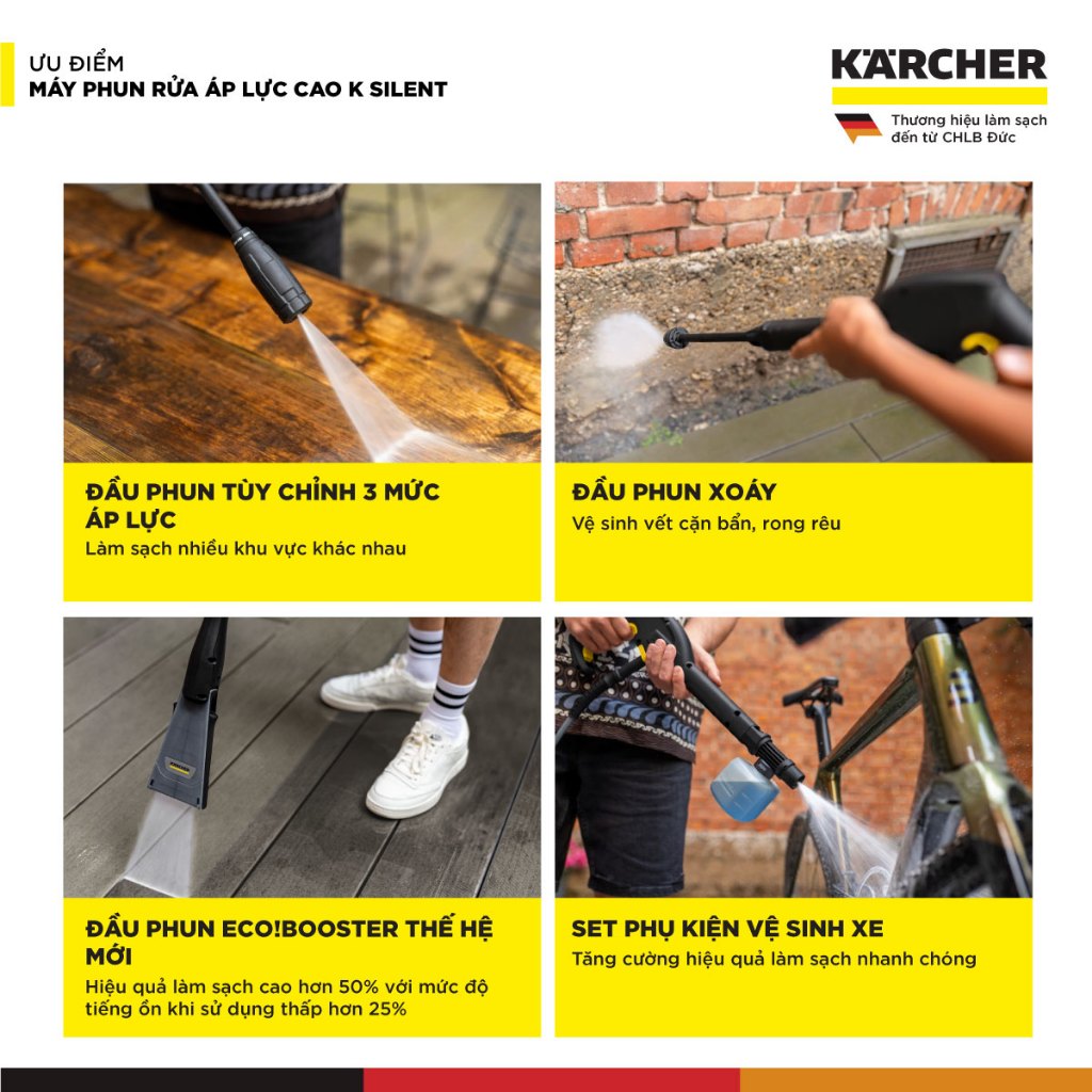 - Đầu phun Vario Power: Điều chỉnh áp suất chính xác cho mọi bề mặt.