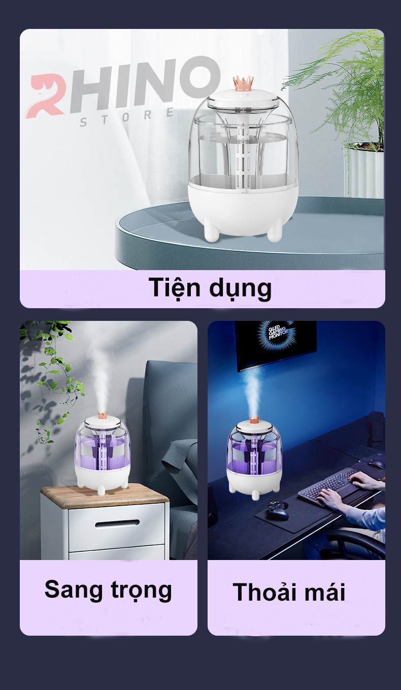 Mua tại TiktokMáy phun sương xông tinh dầu tạo ẩm Rhino H105 dung tích 1000ml không gây tiếng ồn, tích hợp đèn ngủ RGB nhiều màu Máy phun sương tạo ẩm là một thiết bị rất cần thiết đối với mọi gia đình trong thời tiết khô hanh, độ ẩm thấp với tác dụng chính là cấp thêm độ ẩm trong không khí. Từ đó giúp da không bị mất nước, khô nứt nẻ đặc biệt vùng môi và da mặt tạo ra môi trường sống thoải mái và dễ chịu nhất, không còn mặc cảm khi tiếp xúc với mọi người. Khi kết hợp với tinh dầu sẽ tạo ra bầu không khí dễ chịu, tránh nấm mốc và côn trùng ruồi muỗi (không nên lạm dụng và phải chọn đúng tinh dầu chất lượng tốt)