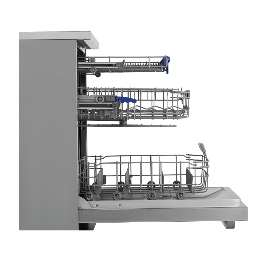 ĐẶC TÍNH SẢN PHẨM Máy rửa bát lắp độc lập hoặc âm tủ Máy rửa bát độc lập thể hệ mới 3 khay chứa động cơ IEC New Basket + 1 giỏ để đũa, ly