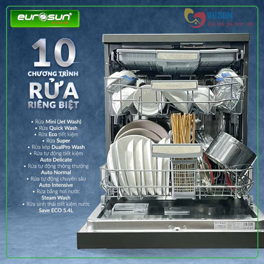 MÁY RỬA BÁT EUROSUN SMS80EU15E NHẬP KHẨU NGUYÊN CHIẾC TỪ CHLB ĐỨC VỚI THIẾT KẾ SANG TRỌNG CÙNG DUNG TÍCH CHỨA LÊN TỚI TRÊN 14 BỘ BÁT ĐĨA. AN TOÀN, BỀN BỈ VÀ TIẾT KIỆM