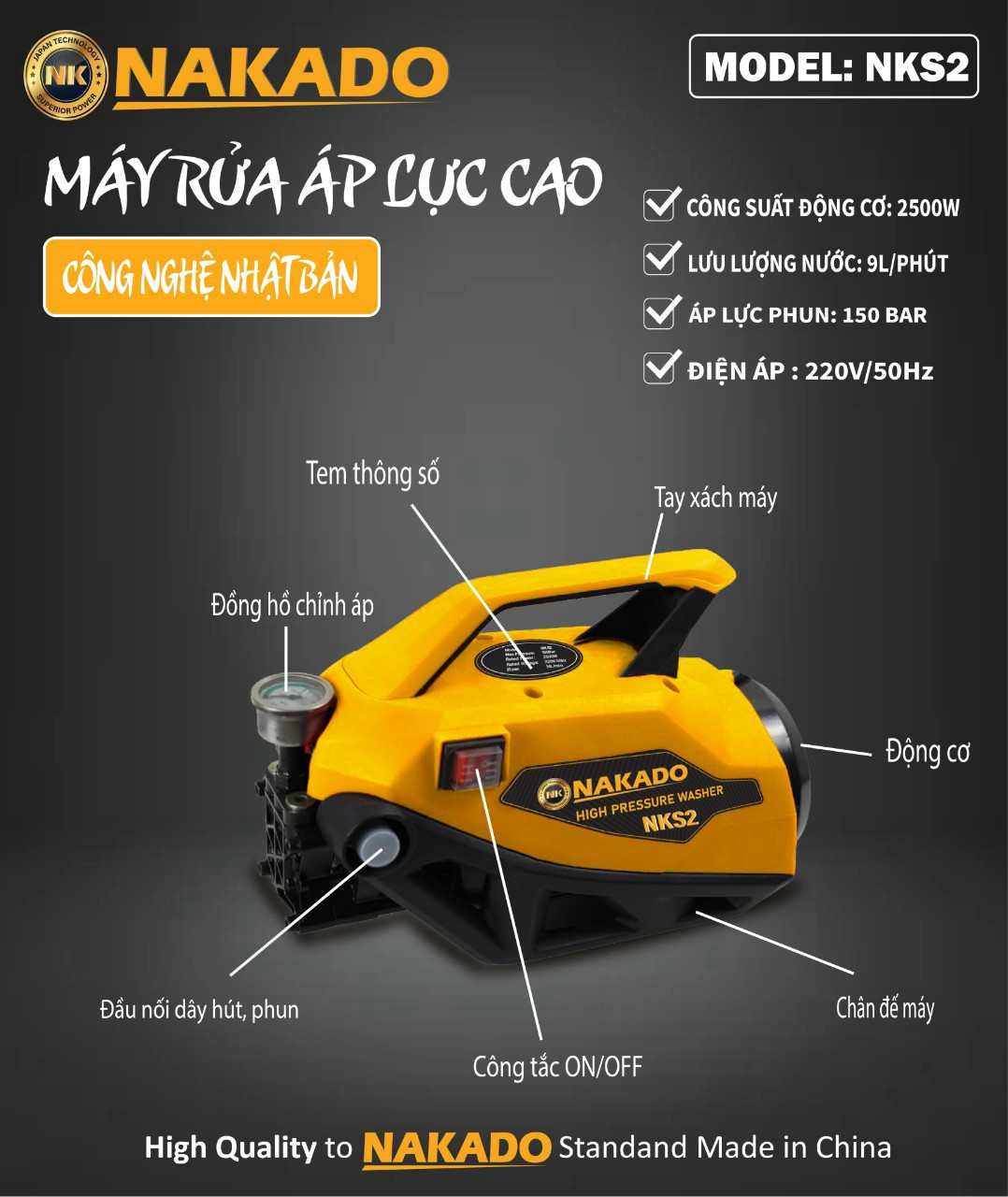 MÁY RỬA XE NAKADO 2500W 100% DÂY ĐỒNG được sản xuất theo công nghệ Nhật Bản, máy có thiết kế gọn nhẹ, đẹp mắt, dễ dàng cầm, xách đi mọi nơi. Máy được trang bị mô tơ lõi đồng cảm ứng từ chạy êm, ít ồn, bền hơn các loại chổi than cũ, máy rửa xe tự động, khi không bóp máy sẽ dừng hoạt động. Máy rửa xe gia đình mini phù hợp rửa xe, rửa sân, kho bãi, rửa máy lạnh….
