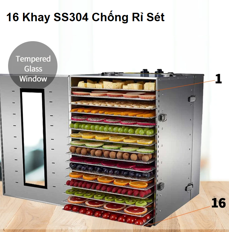 - Hệ thống nhiệt: Nhiệt được làm nóng tự động 360 độ, quanh đều 16 khay sấy