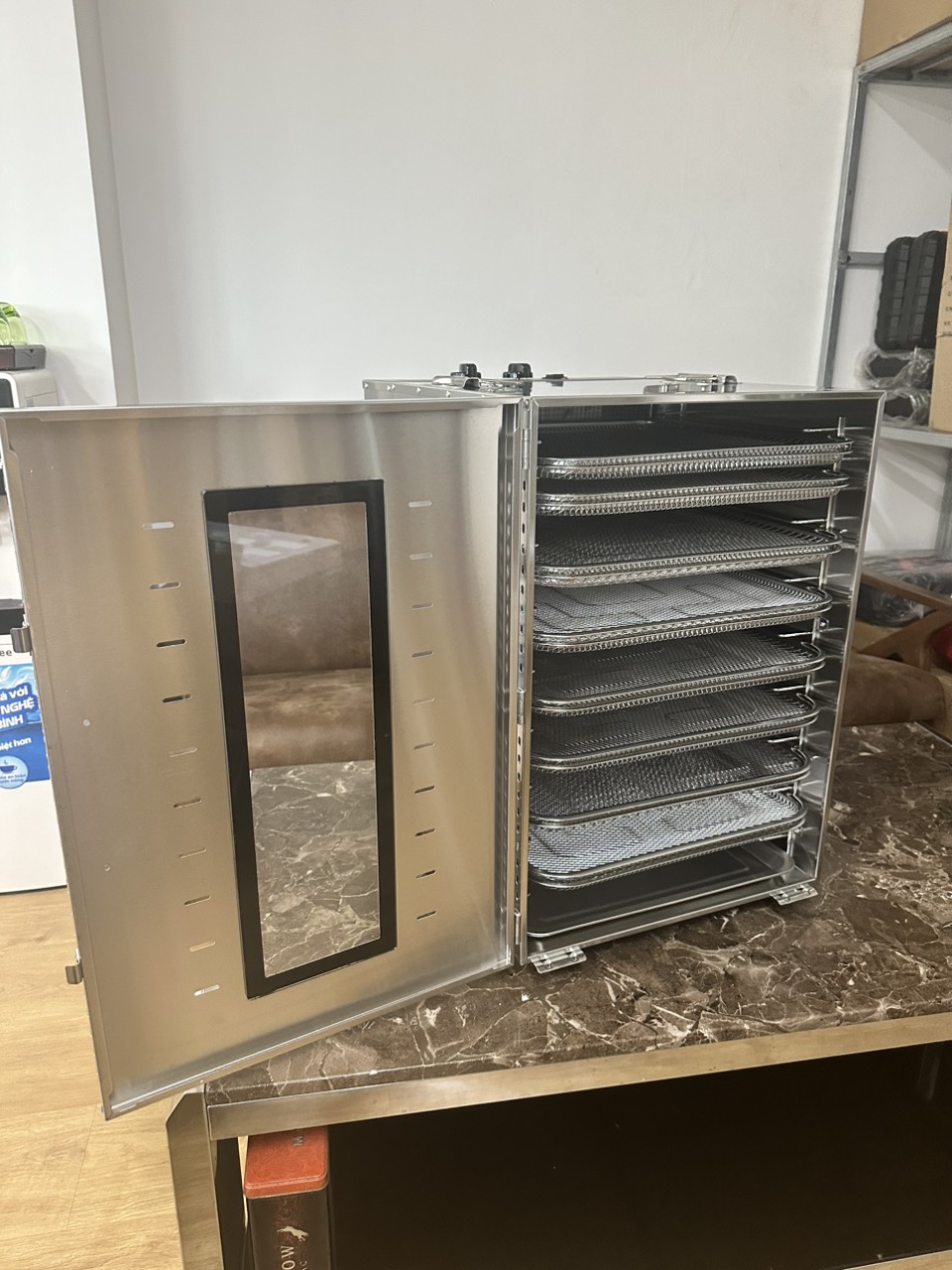 - Hệ thống gia nhiệt tự động 360 độ vòng quanh cho 16 khay lưới inox, giúp thực phẩm được sấy chuyên nghiệp rất đều và thơm ngon.