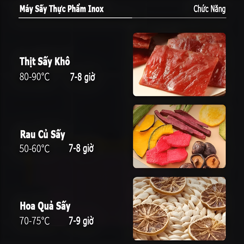 • Sấy thịt cá với biên độ nhiệt từ 70- 90°C: là trợ thủ đắc lực khi bạn bạn làm các món khô gà, khô bò, khô heo, khô nai, khô mực, khô cá..vv