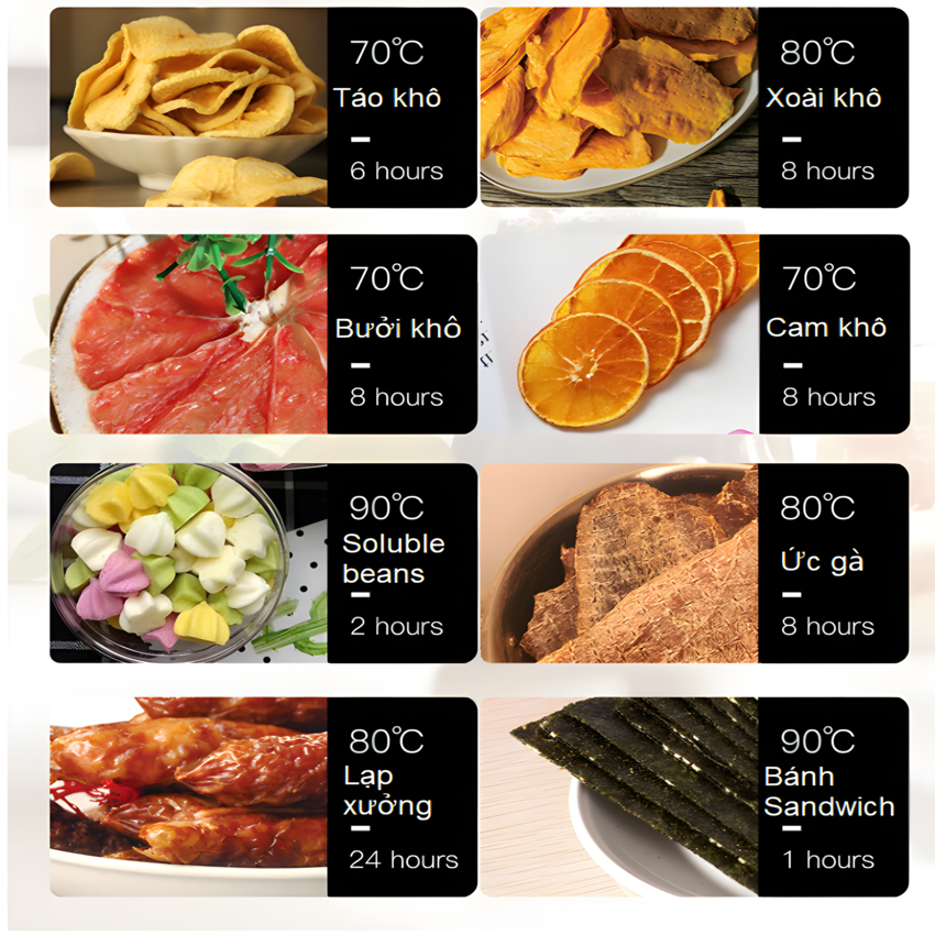 - Cài đặt thời gian sấy: 0.5 – 24 giờ