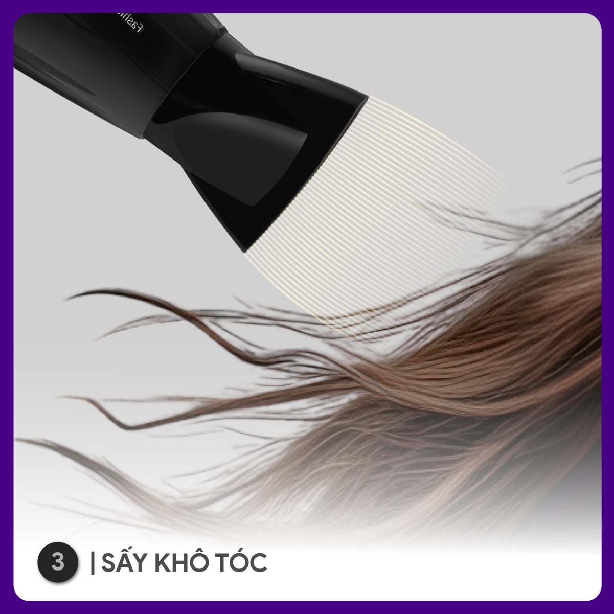Tính năng Tương đương với công suất sấy 2300W* Nhờ sự kết hợp cân bằng giữa luồng khí mạnh mẽ và phân phối nhiệt nên máy sấy 2000W này hoạt động hiệu quả tương đương với máy sấy 2300W*. *So với hiệu suất của máy sấy của tóc Panasonic 2300W. Hiệu suất sấy cao Cấu trúc độc đáo bên trong là bí quyết mang lại hiệu suất sấy cao cho một chiếc máy sấy nhỏ gọn. Thiết kế bên trong của máy sấy đã được cải tiến để cung cấp nhiệt độ không khí mạnh mẽ và ổn định với tốc độ quạt nhanh hơn. Đầu sấy tập trung 11 mm kiểu mới giúp tạo kiểu tóc chính xác và hoàn hảo Đầu sấy tập trung 11 mm kiểu mới của Panasonic giúp tập trung luồng khí trực tiếp lên tóc của bạn, cho phép tạo kiểu tóc chính xác và đơn giản hơn. Chế độ bảo vệ nhiệt giúp ngăn ngừa hiện tượng quá nhiệt Tóc và da đầu sẽ được sấy khô ở nhiệt độ tối ưu, giúp bảo vệ tóc không bị quá nóng. Tay cầm có thể gập gọn Tay cầm có thể gập gọn, cho phép cất gọn máy sấy khi không sử dụng và lý tưởng cho việc sử dụng khi đi du lịch. Gọn nhẹ & Dễ cầm nắm Với thiết kế tiện dụng, máy sấy tóc có trọng lượng cân đối, mang đến trải nghiệm sấy tóc ổn định và thoải mái.