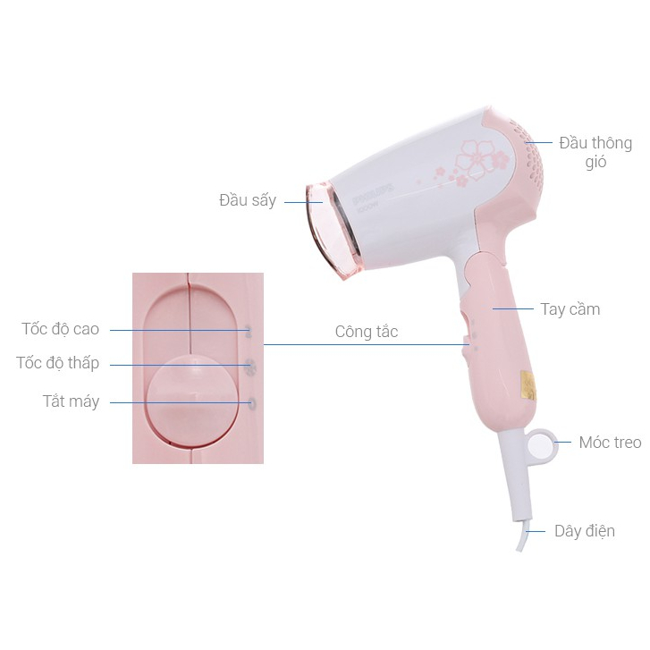 Máy sấy tóc Philips có công suất lớn 1200W Máy sấy tóc Philips BHC010/00 sở hữu thiết kế màu hồng xinh xắn, kiểu dáng nhỏ gọn, dễ sử dụng với tay cầm có thể gập lại, thuận tiện cho